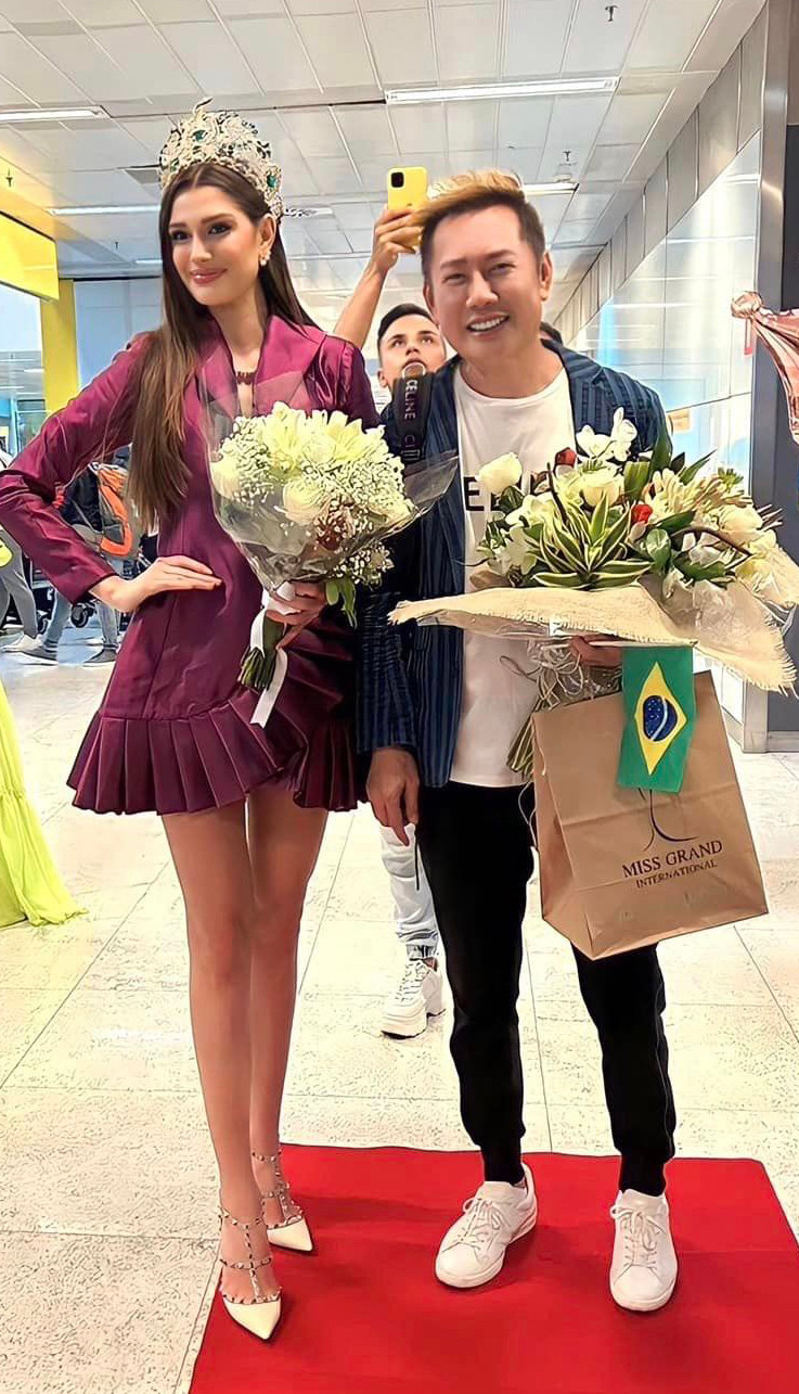 Ngày 5/3, Hoa hậu Hòa bình Quốc tế 2022 Isabella Menin trở về quê nhà Brazil sau hơn 4 tháng đăng quang. Đi cùng cô là ông Nawat - chủ tịch cuộc thi Miss Grand International.