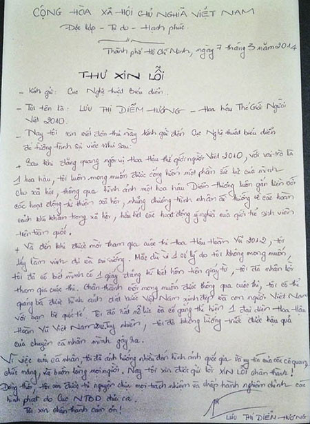 "Tôi xin được gửi lời xin lỗi chân thành. Đồng thời, xin tự nguyện chịu mọi trách nhiệm và chấp hành nghiêm chỉnh các hình phạt do Cục đưa ra", Hoa hậu viết.