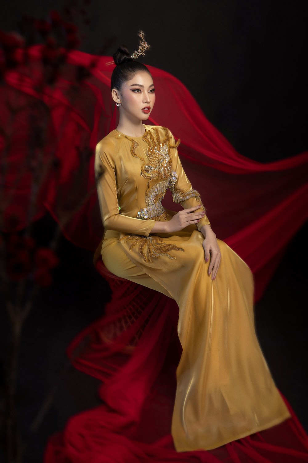 Á hậu Phương Anh diện áo dài gam màu vàng với họa tiết rồng phượng cầu kỳ.