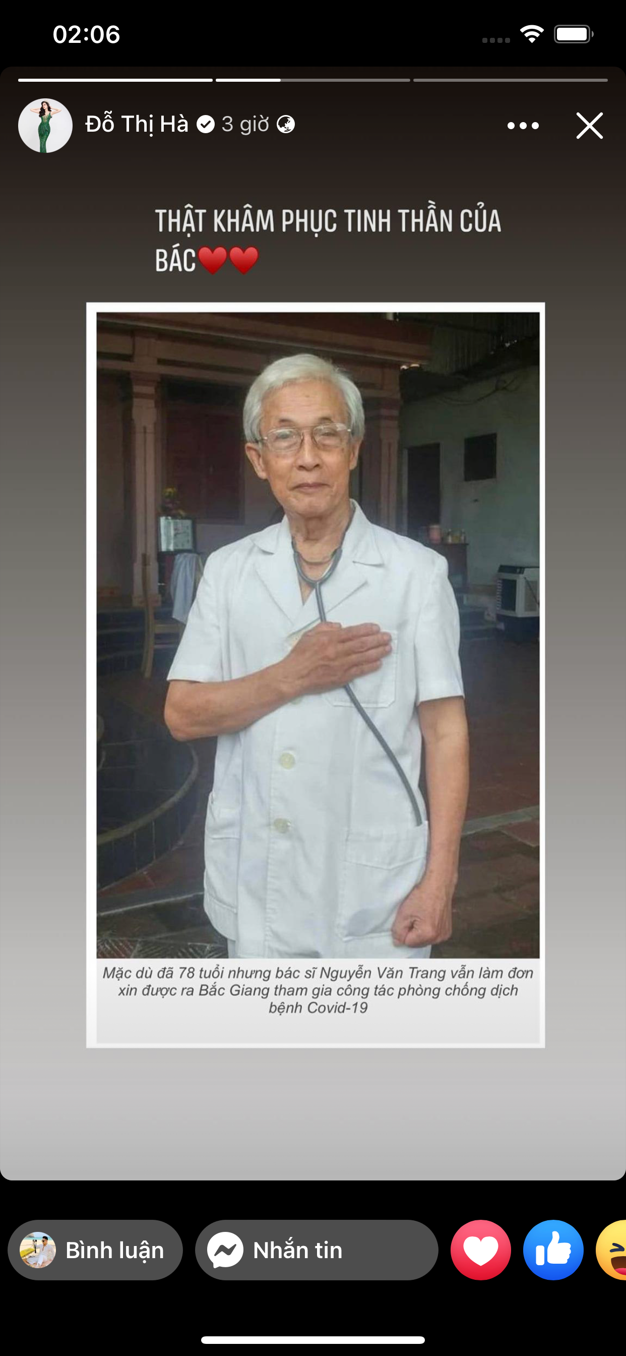 | Hoa hậu Đỗ Thị Hà chia sẻ cảm xúc câm phục về câu chuyện của bác sĩ Nguyễn Văn Trang trên trang cá nhân. |