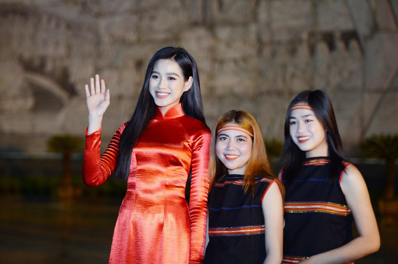 | Hoa hậu Đỗ Thị Hà chụp hình lưu niệm cùng các nghệ sĩ tham gia biểu diễn trong đêm hội cồng chiêng. |