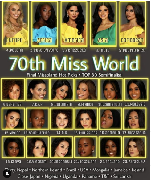 Ngoài ra Top 5 theo thứ tự gồm đại diện của các quốc gia: Venezuela, Bờ Biển Ngà, Ấn Độ, Ba Lan và Puerto Rico.