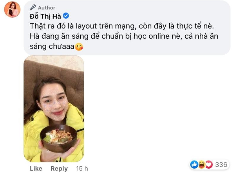 Thế nhưng sau khi ngây ngất với loạt ảnh, người hâm mộ lại bật cười với bình luận ngay bên dưới của nàng hậu. Người đẹp đúng chuẩn Gen Z, tự khoe rằng đấy chỉ là “layout trên mạng”, còn trên thực tế, cô nàng khoác áo phao ấm áp đang chuẩn bị ăn sáng để vào lớp học online.