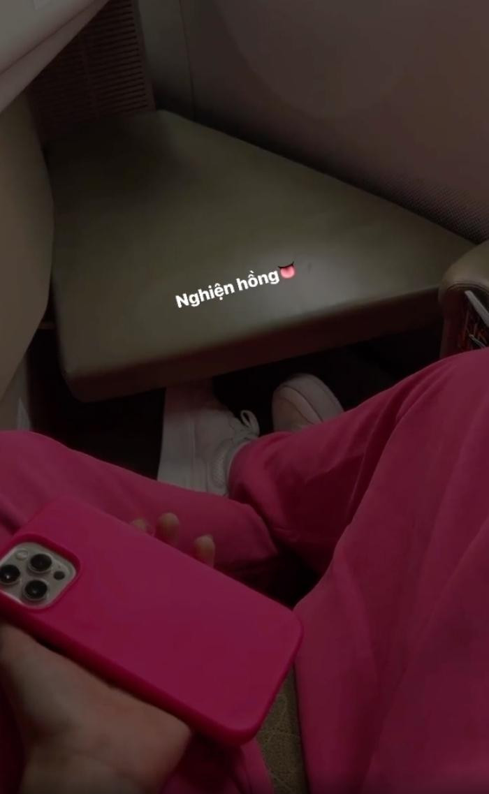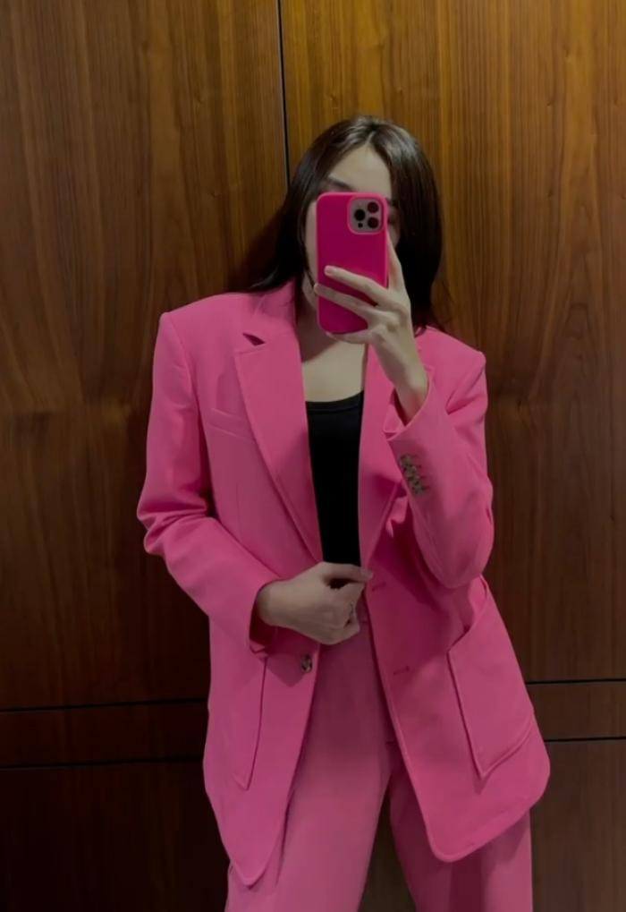 Người đẹp diện nguyên bộ suit hồng, ốp điện thoại cũng màu hồng nốt, cô tự nhận là mình “nghiện hồng”.