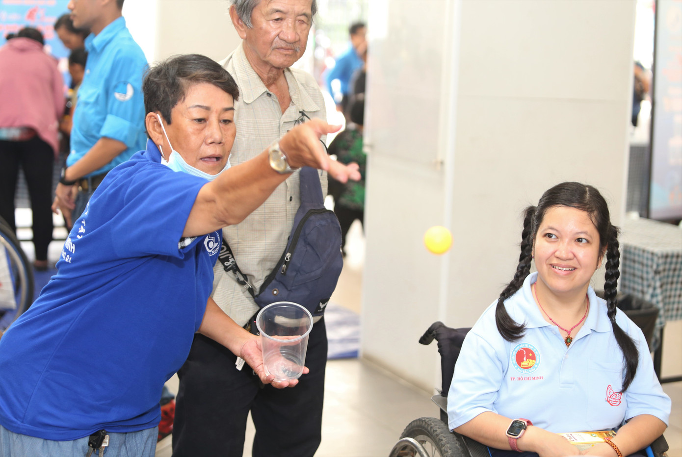 | Các cô chú, anh chị hội viên người khuyết tật phấn khởi tham gia các sân chơi vận động tại buổi họp mặt. |