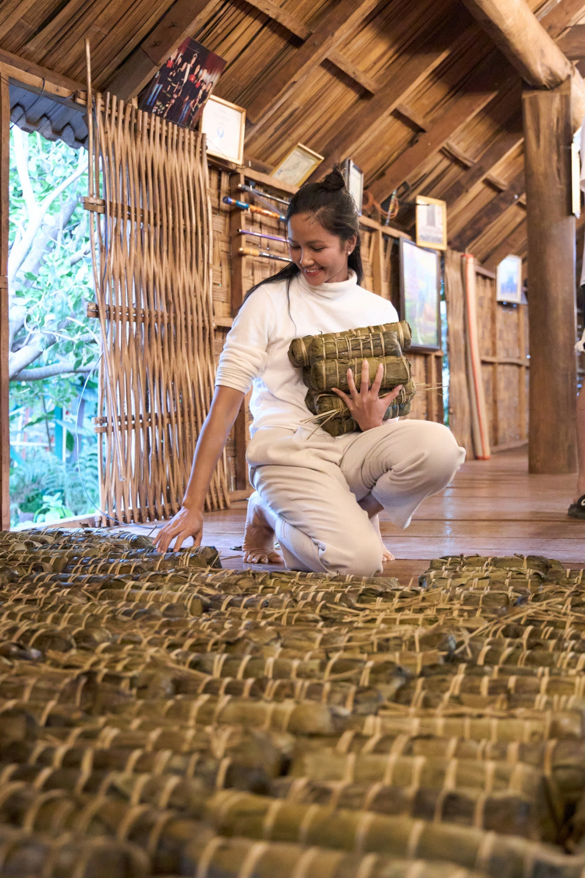 Sau chuyến công tác dài ngày ở Yên Bái và Hà Nội, H’Hen Niê về Đắk Lắk và nhanh chóng nhập hội gói bánh tét cùng gia đình. Năm nào gia đình cô cũng gói bánh tét nhưng số lượng 400 đòn như thế này thì chưa bao giờ. Để hoàn thành số lượng 400 đòn bánh tét, ba mẹ, cô dì chú bác, anh em họ hàng, bạn bè của H’Hen Niê quy tụ về nhà cô và gói bánh trong 5 tiếng đồng hồ.