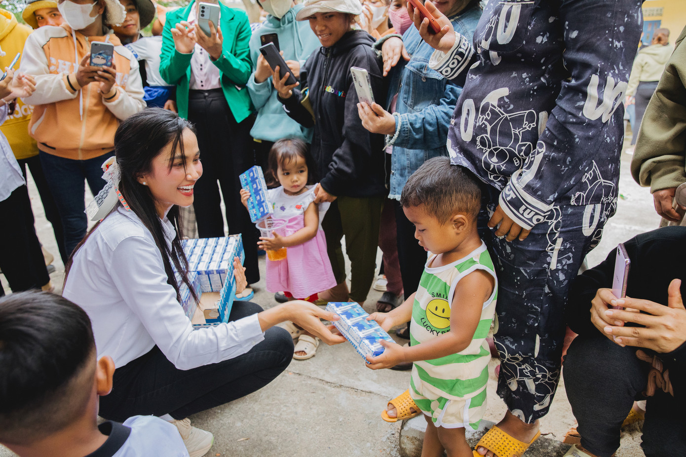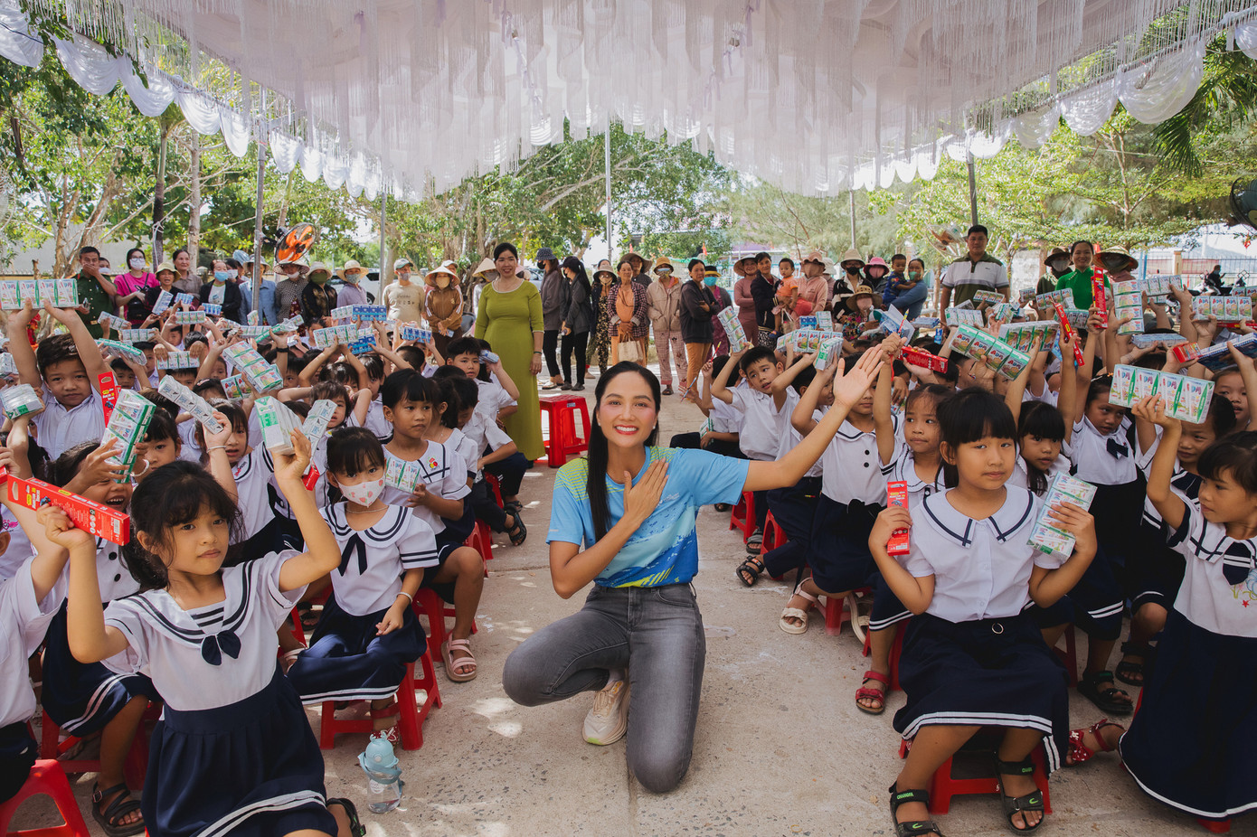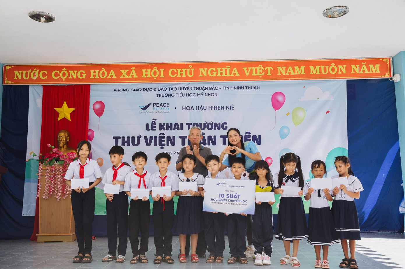 Ngoài việc trao thư viện, H’Hen Niê và đoàn còn tổ chức trao các phần học bổng nhỏ cùng sữa và bút chì, bút bi do các mạnh thường quân ủng hộ.