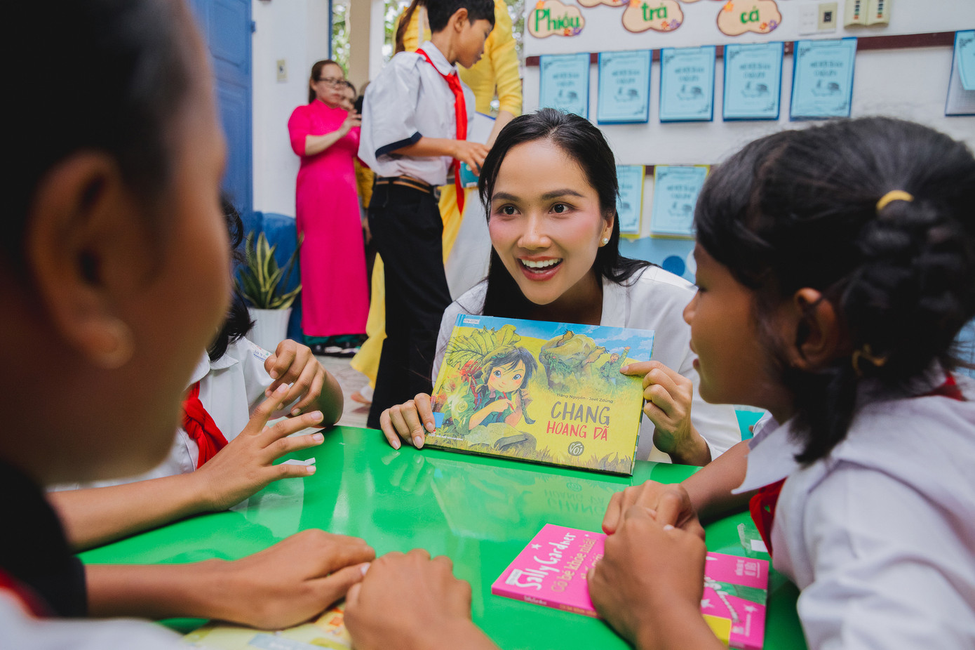 Sau khi "mở cửa" thư viện, "cô Hen" đã cùng với các em học sinh tham gia đọc sách, cô không chỉ kể chuyện mà còn hóa thân thành nhân vật trong truyện cho sinh động hơn. Đây là hoạt động được nàng hậu duy trì đều đặn mỗi lần trao thư viện, như sự khởi đầu và tạo tò mò cho các em khi đến thư viện mới.