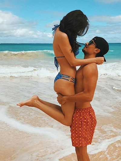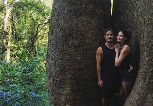 Hoa hậu Hoàn vũ 2015 khoe thân hình nóng bỏng trong bộ đồ bơi hai mảnh, trong khi tay đua xe nổi tiếng Philippines hết mực cưng nựng bạn gái.