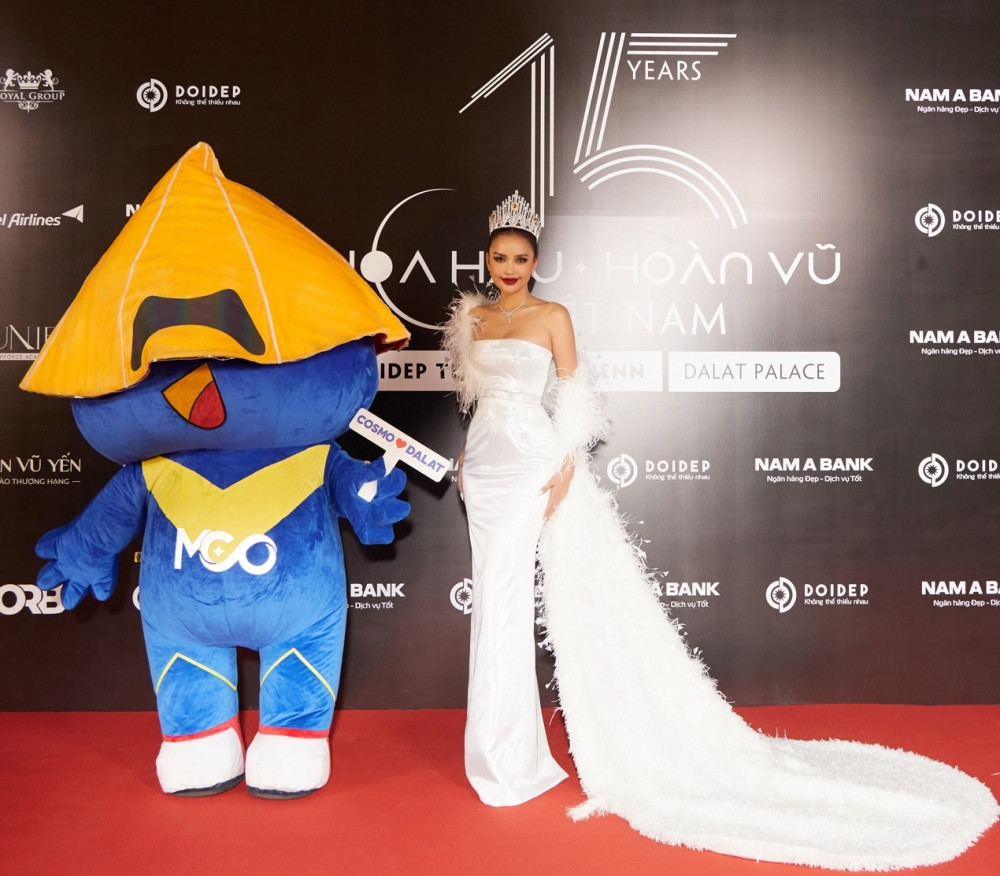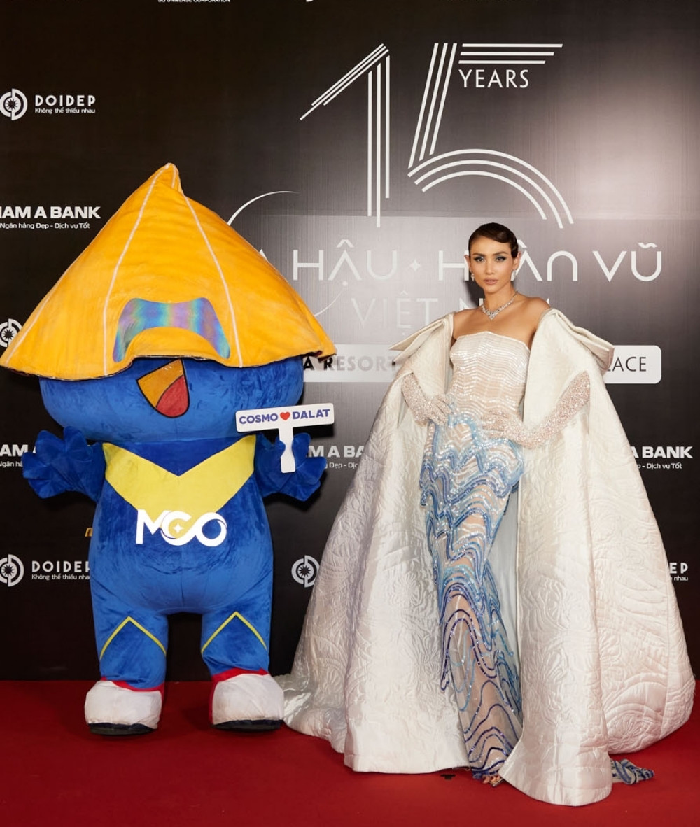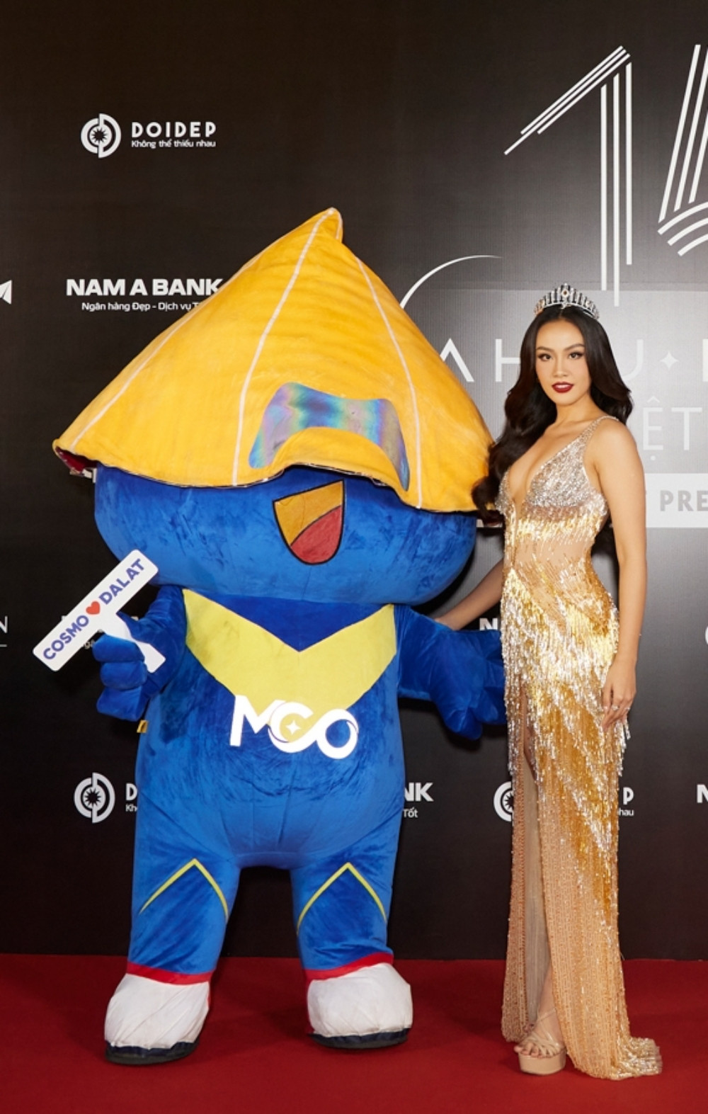 Thảm đỏ của sự kiện Hoa hậu Hoàn vũ Hoàn vũ Việt Nam (Miss Cosmo Vietnam) 2023 còn có mascot (linh vật) Chiến Binh Nón, cùng chào đón và đứng cạnh dàn Hoa - Á hậu.