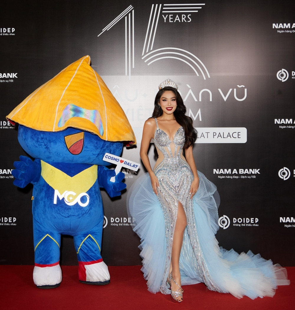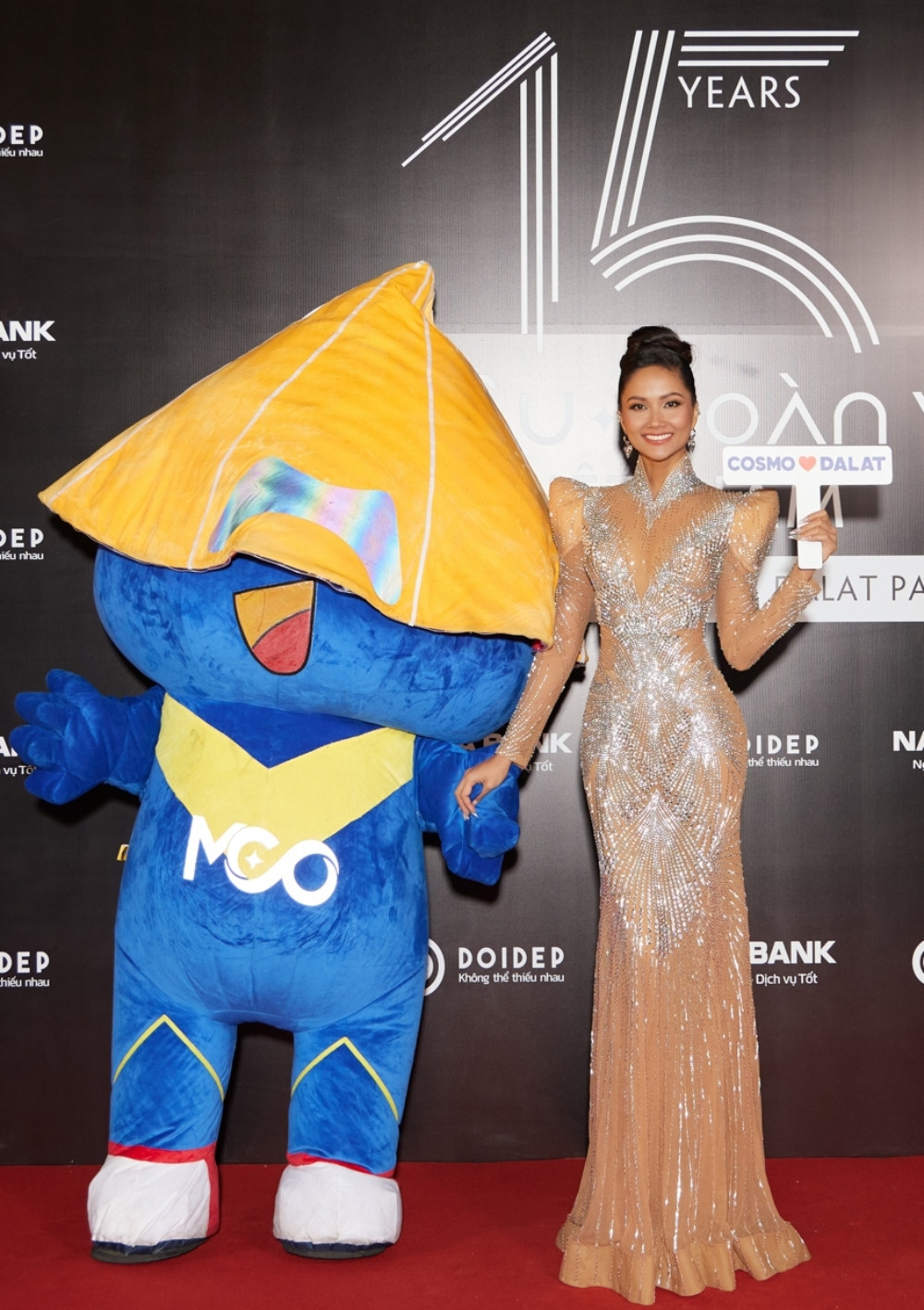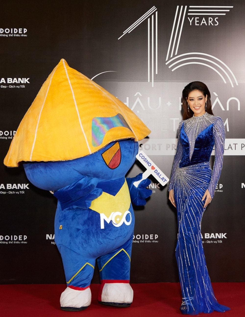 Thảm đỏ của sự kiện Hoa hậu Hoàn vũ Hoàn vũ Việt Nam (Miss Cosmo Vietnam) 2023 còn có mascot (linh vật) Chiến Binh Nón, cùng chào đón và đứng cạnh dàn Hoa - Á hậu.