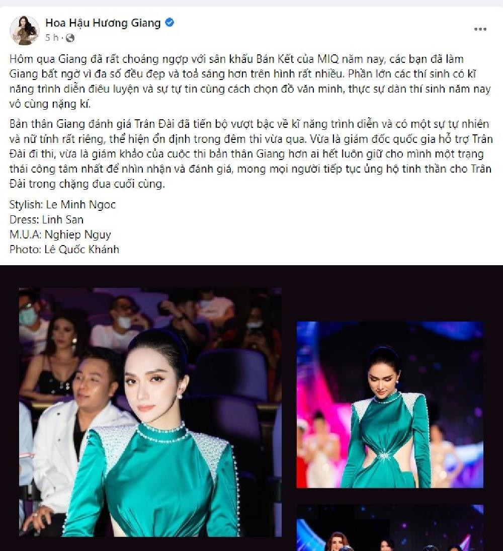 “Hôm qua Giang đã rất choáng ngợp với sân khấu Bán Kết của MIQ năm nay, các bạn đã làm Giang bất ngờ vì đa số đều đẹp và toả sáng hơn trên hình rất nhiều. Phần lớn các thí sinh có kỹ năng trình diễn điêu luyện và sự tự tin cùng cách chọn đồ văn minh, thực sự dàn thí sinh năm nay vô cùng nặng kí.