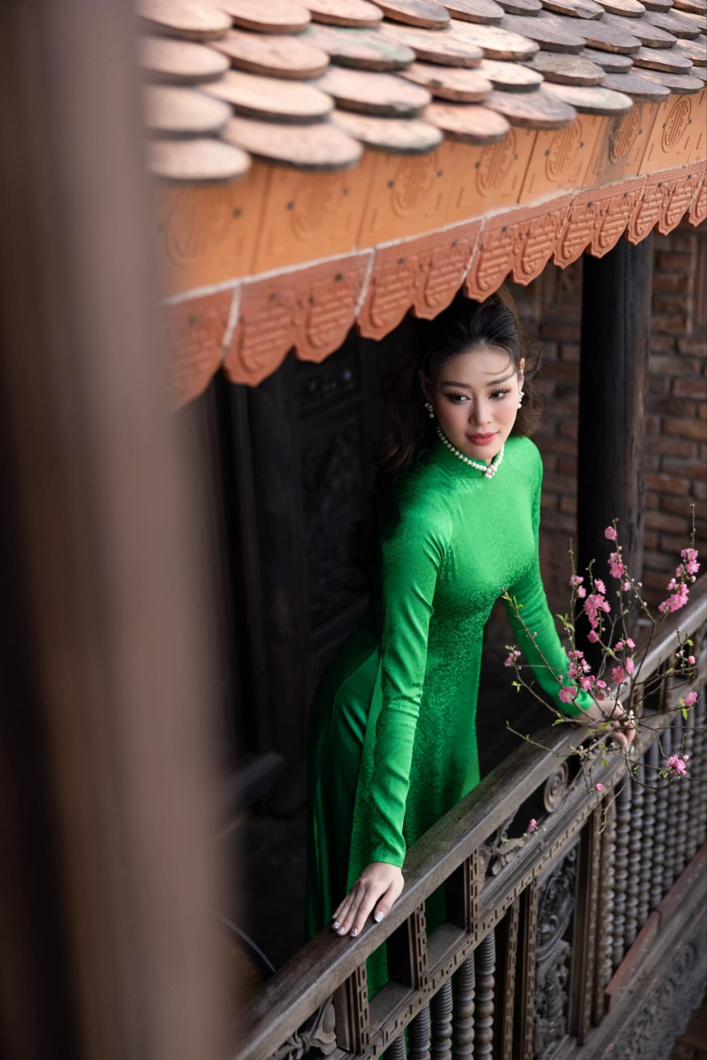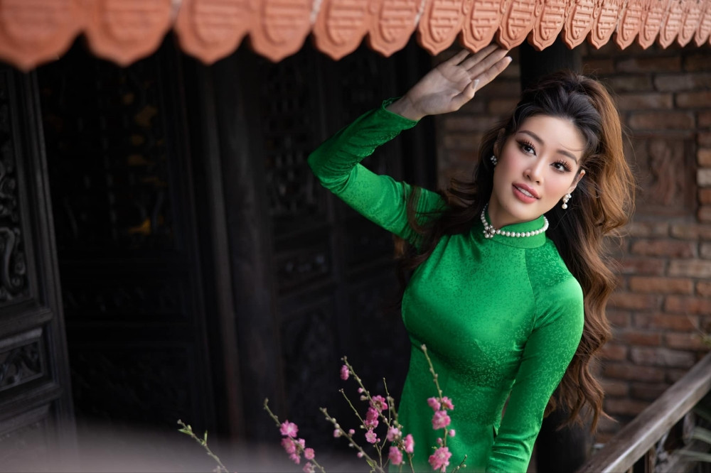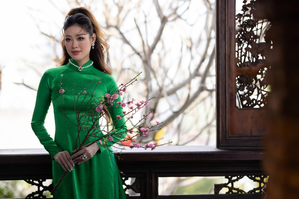 Năm nay, Hoa hậu Khánh Vân chọn mặc áo dài màu xanh lá - màu hợp mệnh với năm Giáp Thìn, cầm theo cành đào nhỏ xinh, mang hơi thở mùa Xuân tràn ngập.