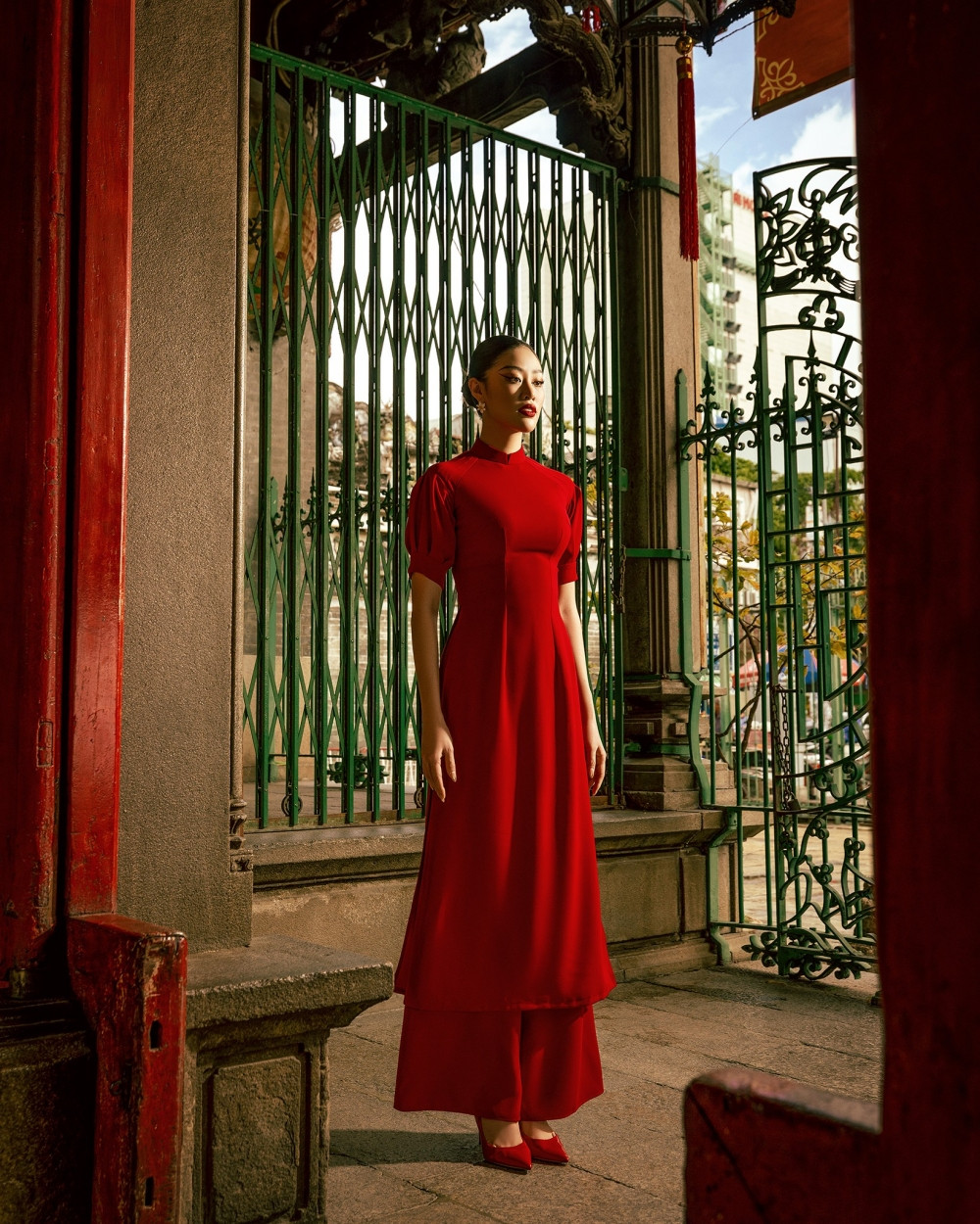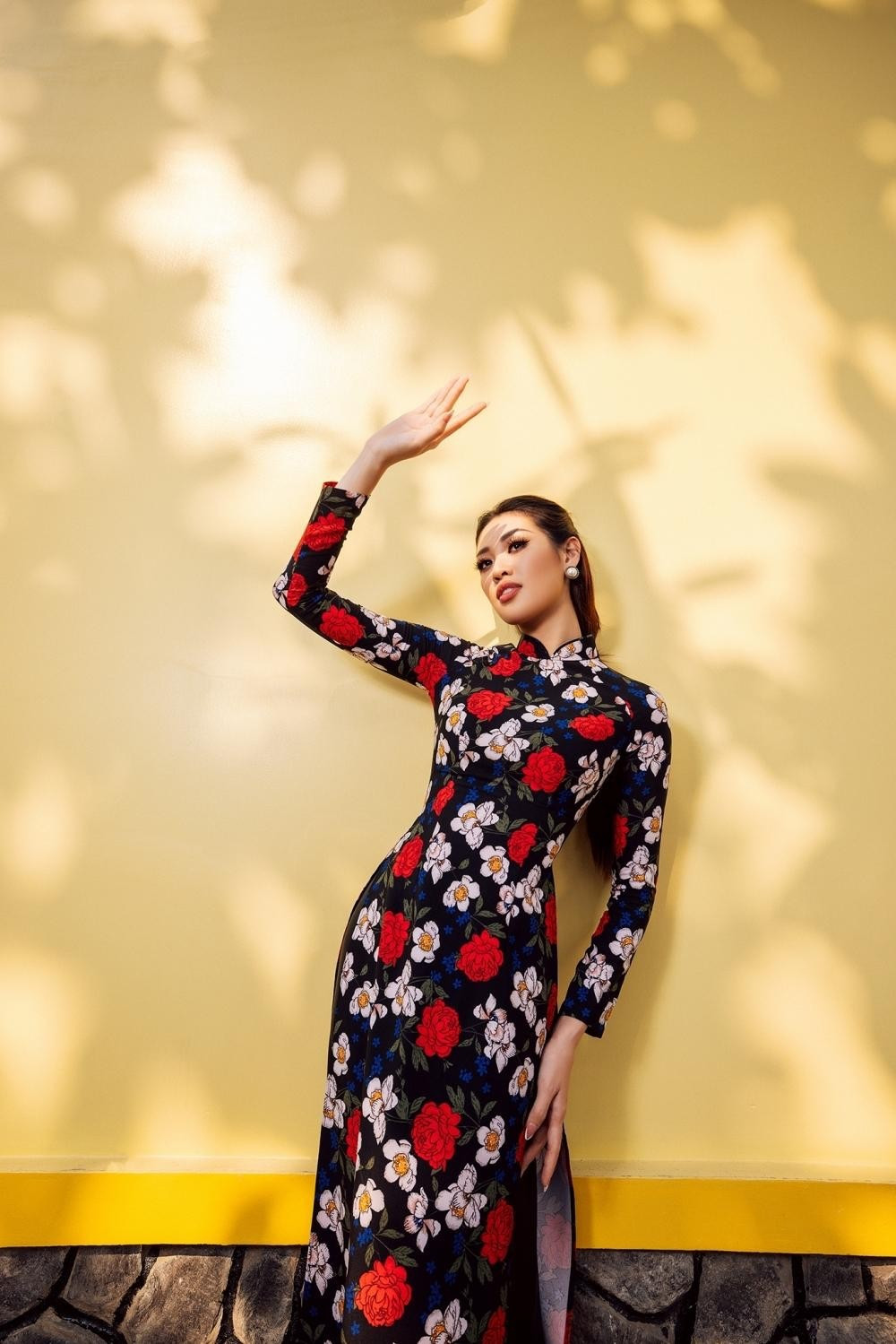 Người đẹp chụp bộ ảnh trong một khung cảnh cũng đậm chất cổ truyền của người Việt, đơn giản mà vẫn đậm không khí Tết. Không ít fan sắc đẹp nhận ra, đây là kiểu dáng áo dài mà Hoa hậu Khánh Vân luôn yêu thích.