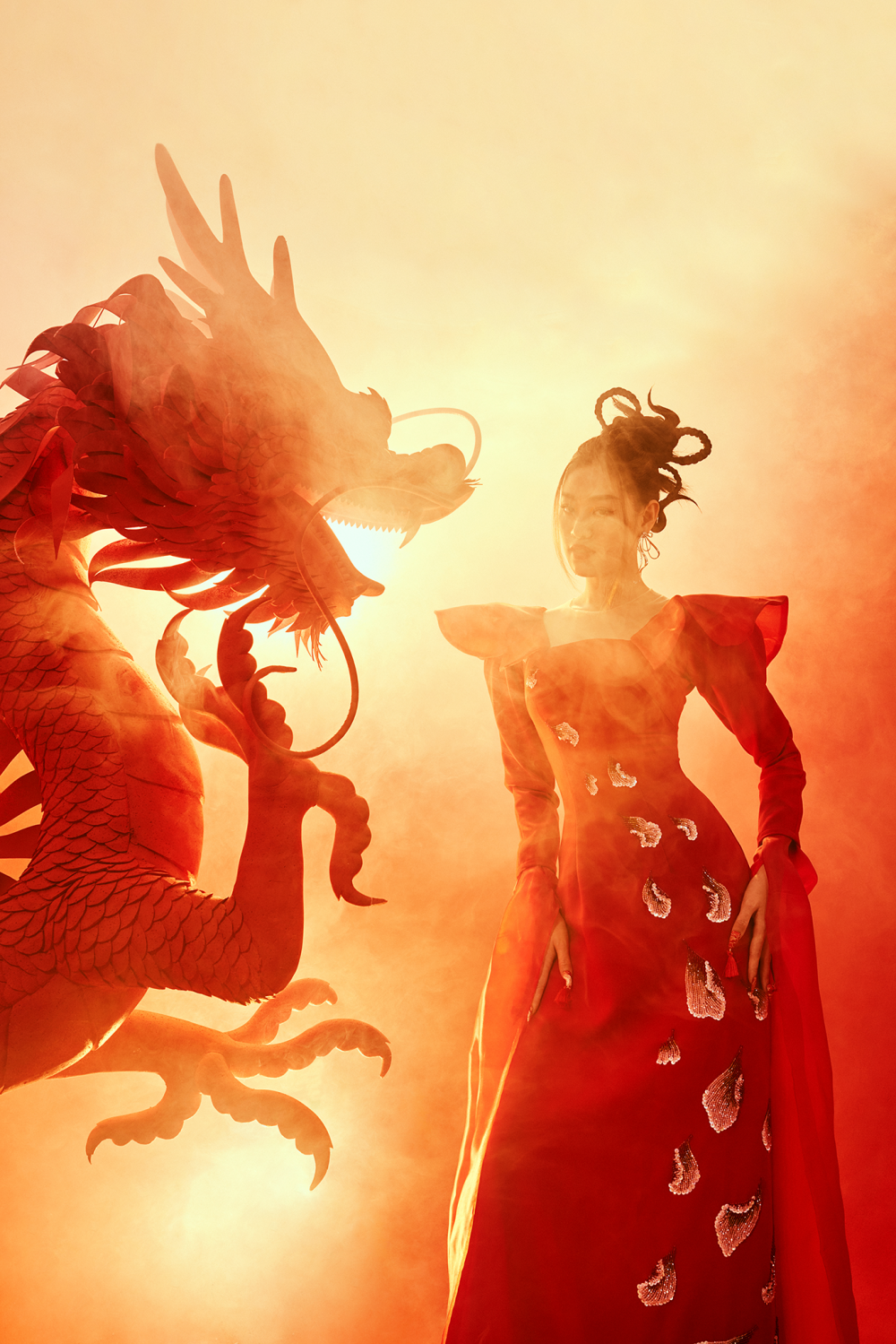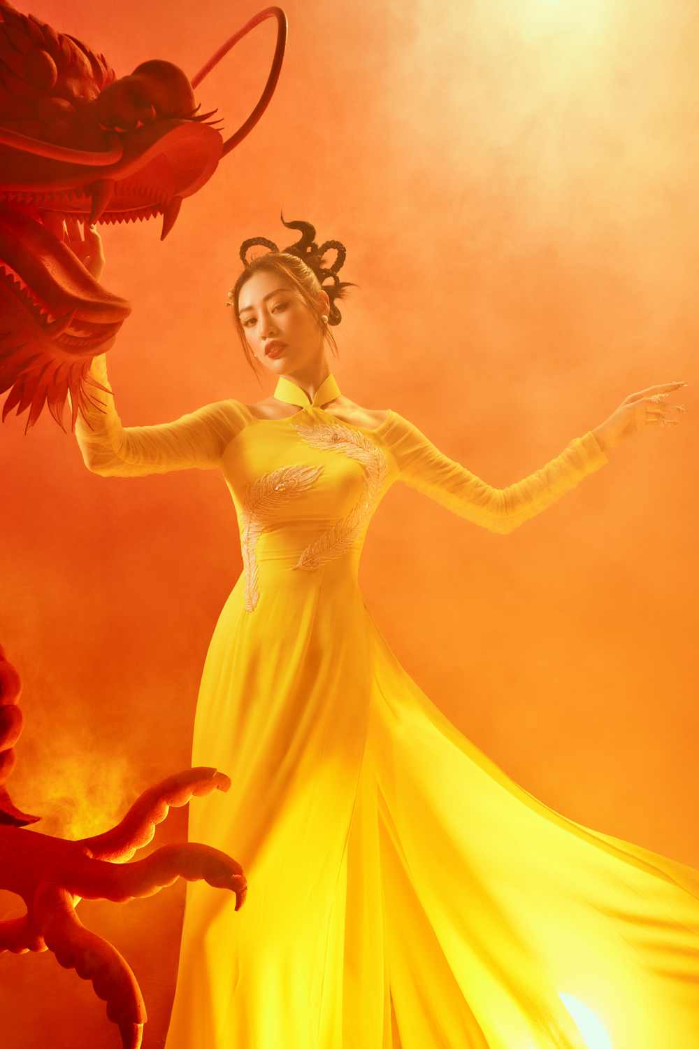 Khánh Vân trong bộ ảnh đón Tết Quý Mão 2023, người đẹp chọn hai mẫu áo dài màu sắc và cách điệu khác nhau, nhưng vẫn là ôm sát phần thân trên.