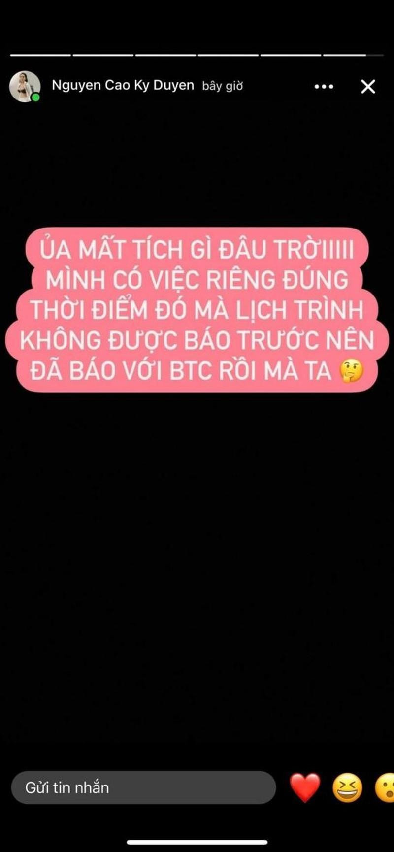 Trước loạt đồn đoán từ netizen, mới đây, Hoa hậu Kỳ Duyên đã chính thức xác nhận về lý do vắng mặt. Theo đó, trên Story Instagram cá nhân, Kỳ Duyên bày tỏ sự ngạc nhiên: “Ủa mất tích gì đâu trời. Mình có việc riêng đúng thời điểm đó mà lịch trình không được báo trước nên đã báo với ban tổ chức rồi mà ta”.