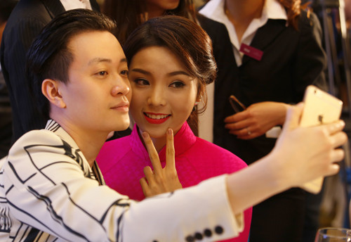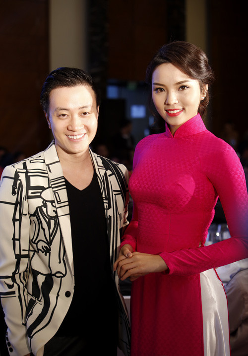 Cô chọn tà áo dài màu đỏ rực rỡ, khoe vóc dáng quyến rũ, tạo dáng bên nam diễn viên Lương Mạnh Hải ở sự kiện.