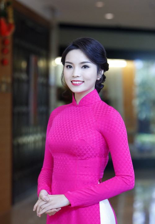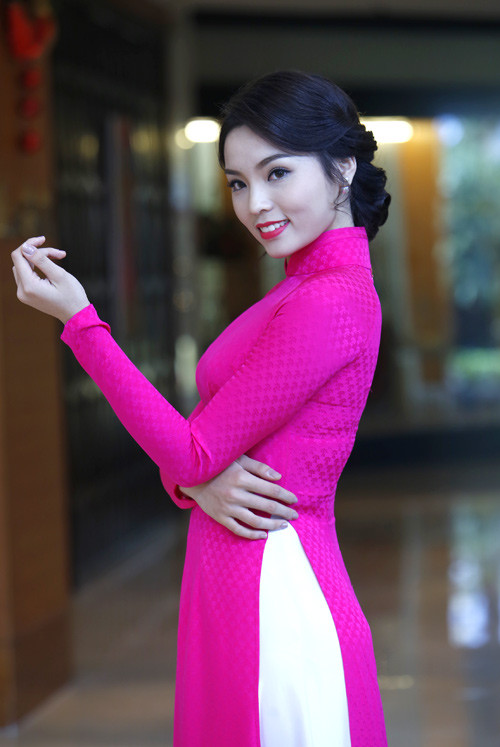 Cô chọn bộ áo dài màu hồng rực rỡ để phù hợp với không khí đón chào năm mới đang rất cận kề.