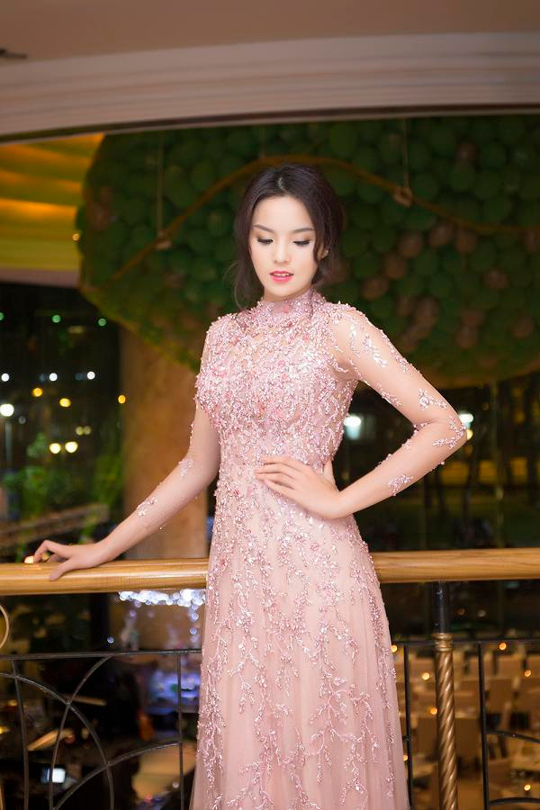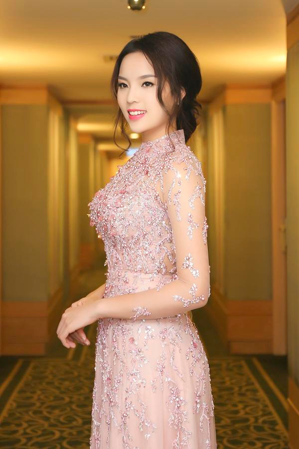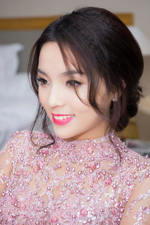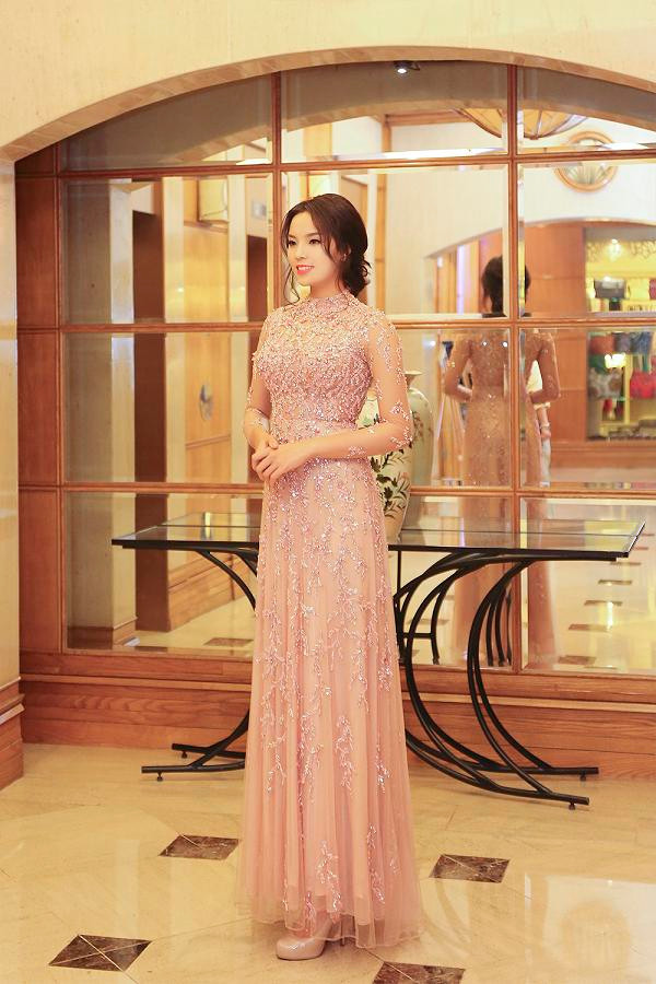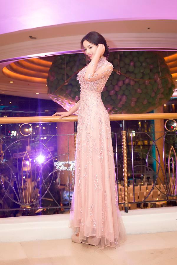 Cô mặc bộ váy màu hồng nhạt đính đá cầu kỳ do nhà thiết kế Hoàng Hải thực hiện.