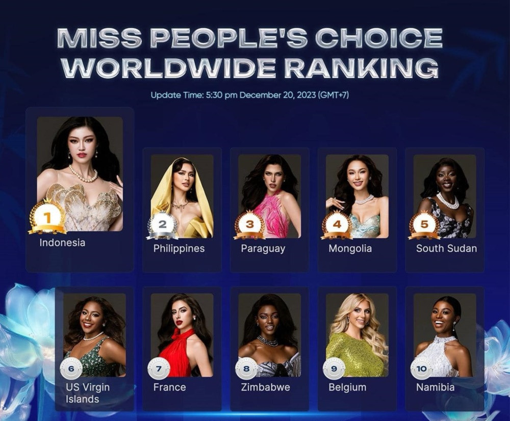 Đại diện Indonesia bất ngờ vọt lên dẫn đầu danh sách Top 10 Miss People’s Choice (Người đẹp được yêu thích nhất), Hoa hậu Lan Anh không có tên trong danh sách này. Người đẹp chiến thắng giải thưởng phụ này sẽ được vào thẳng Top 20 chung cuộc của Miss Earth 2023.