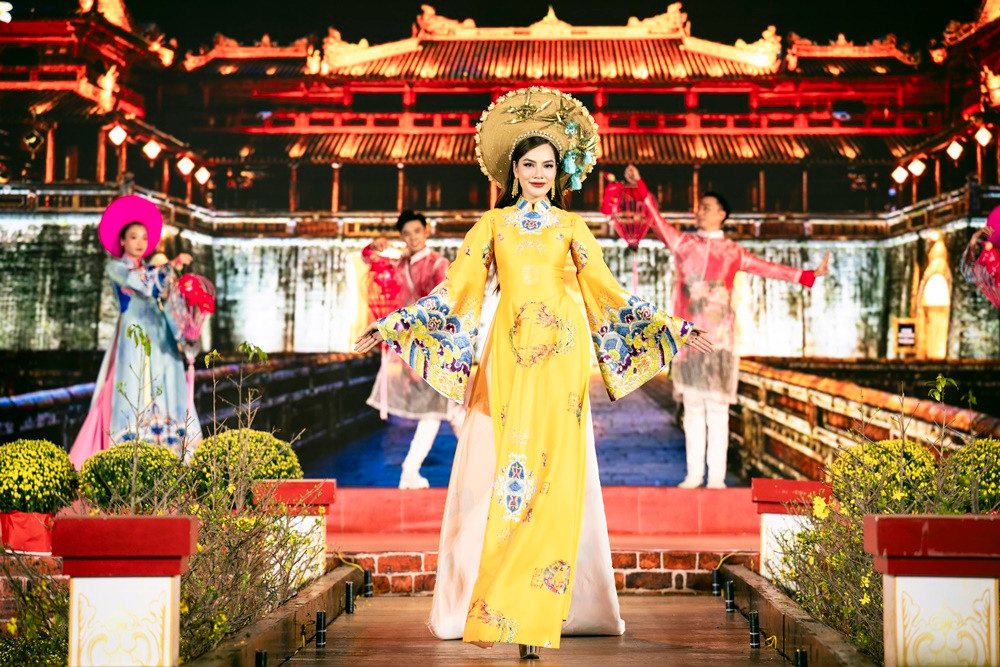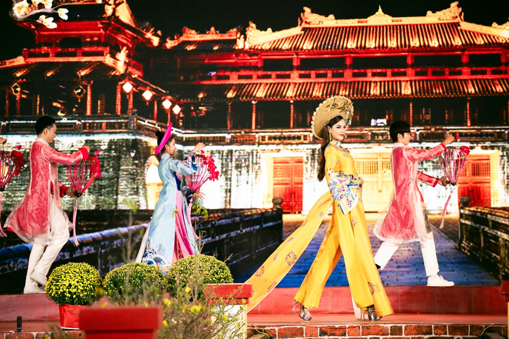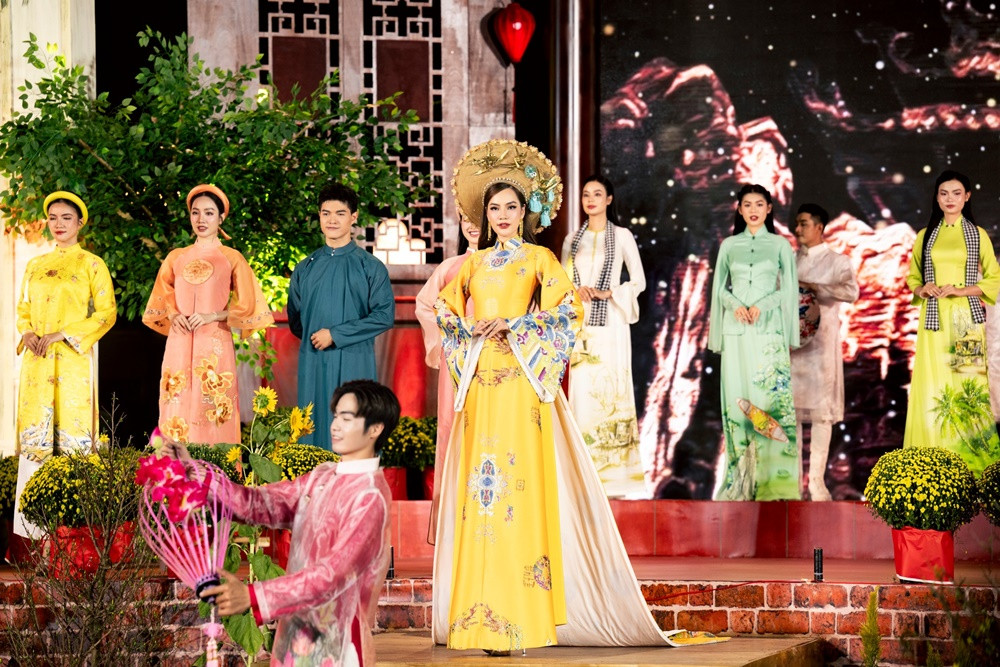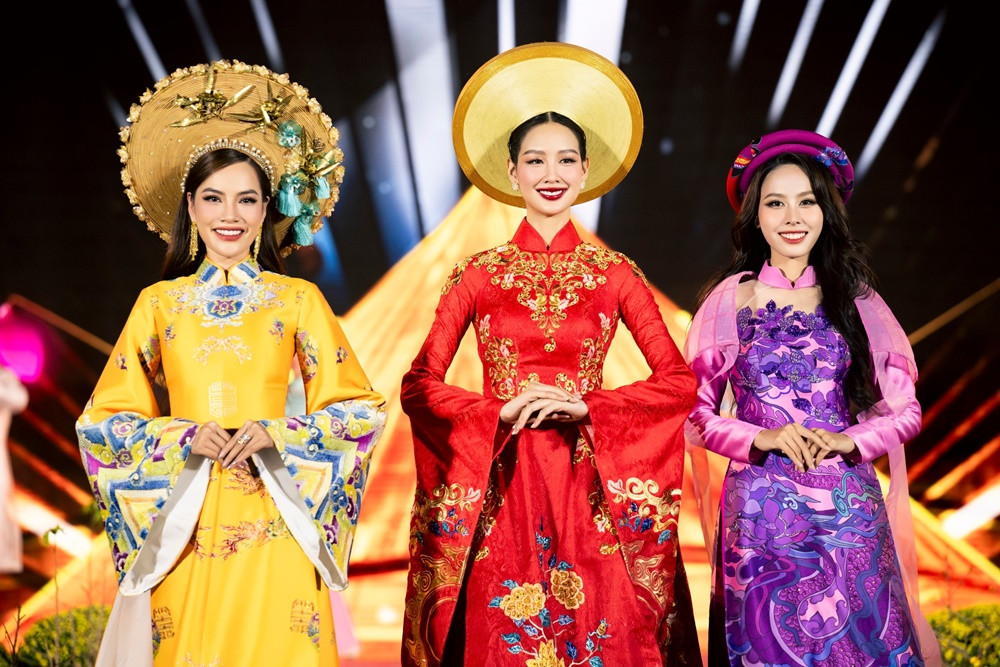 Xuất hiện bên cạnh hai đại sứ khác là Hoa hậu Bảo Ngọc và Á hậu Ngọc Hằng, Hoa hậu Lê Hoàng Phương khoe nhan sắc ngày càng mặn mà. Trong tiết mục mở màn lẫn phần trình diễn áo dài, người đẹp sinh năm 1995 nổi bật trong chiếc áo dài sắc vàng.