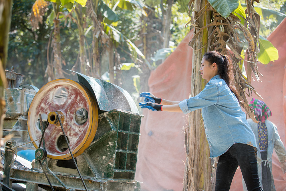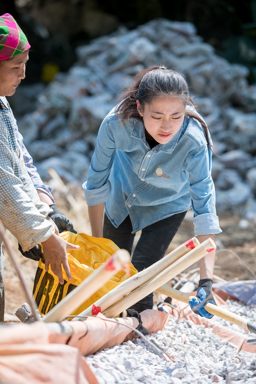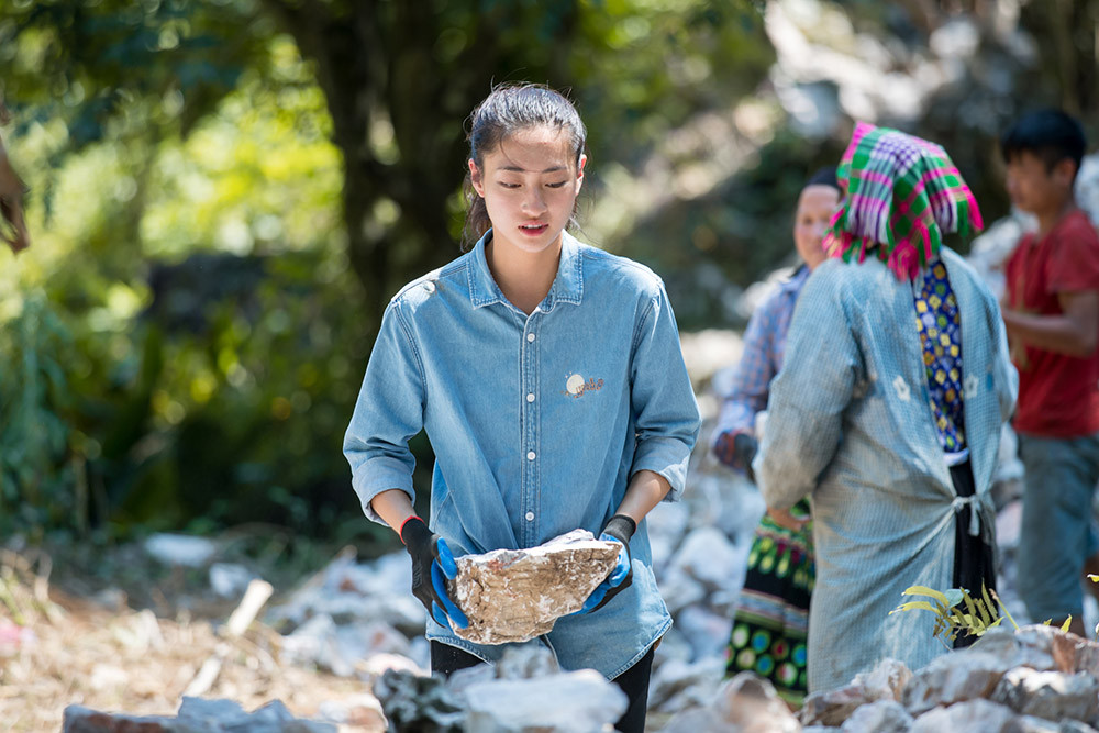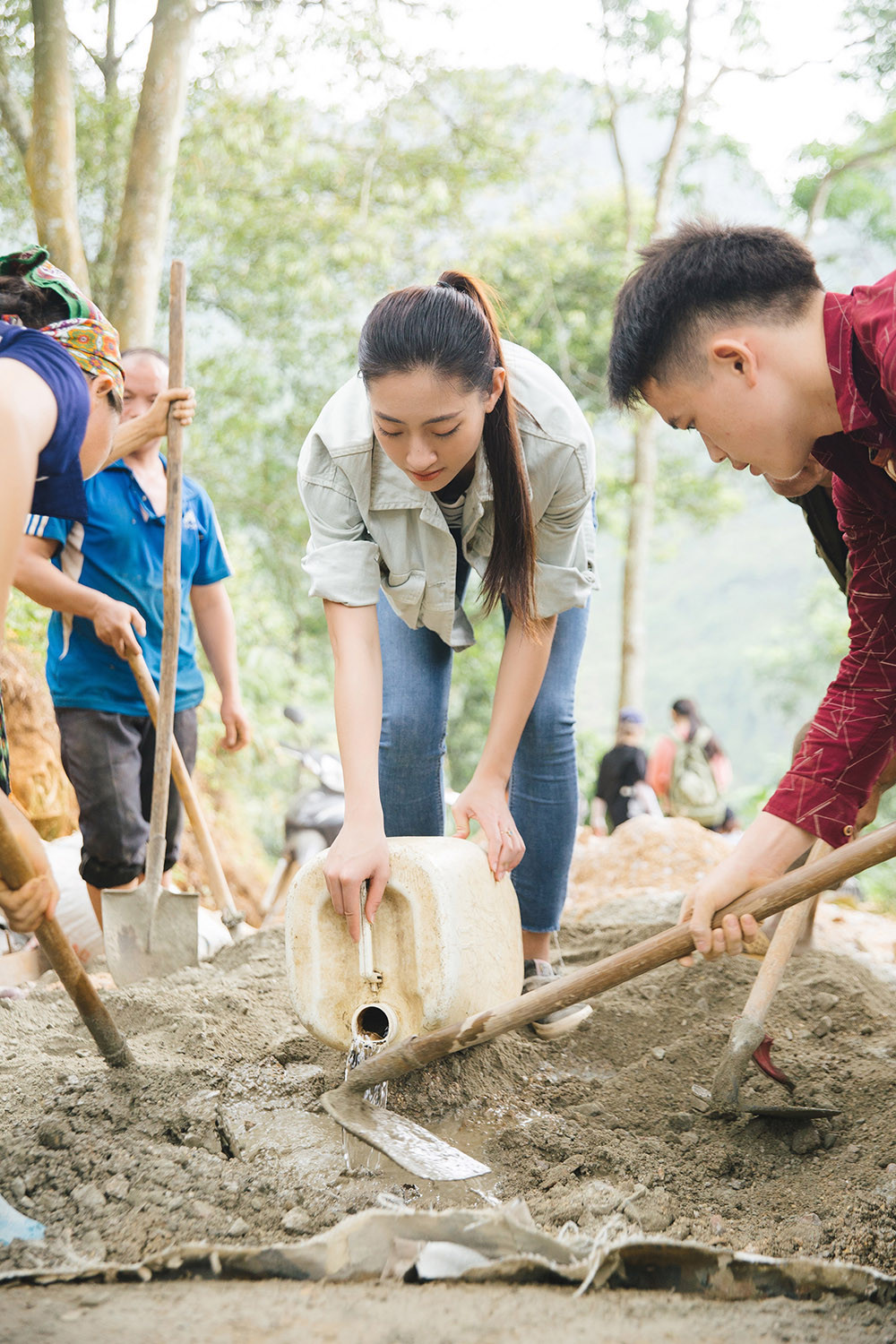 Lương Thuỳ Linh còn tham gia vào các giai đoạn thi công khác như nghiền đá, xúc đất, trộn vữa,…tiếp thêm sức mạnh tinh thần cùng bà con hoàn thành con đường.