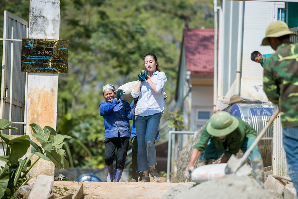Không những thế, chính hoa hậu Lương Thùy Linh còn đích thân tham gia quá trình vận chuyển nguyên vật liệu.