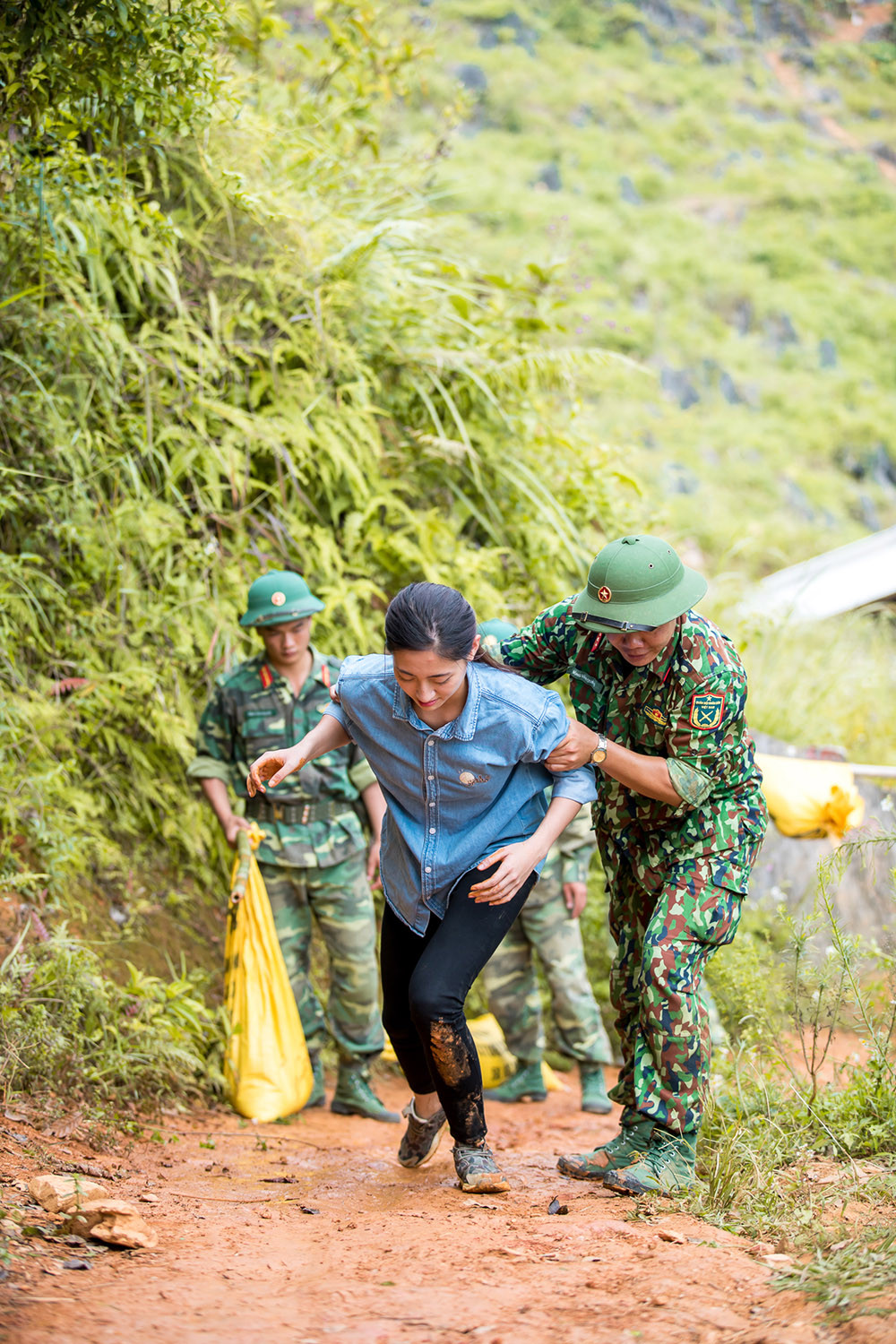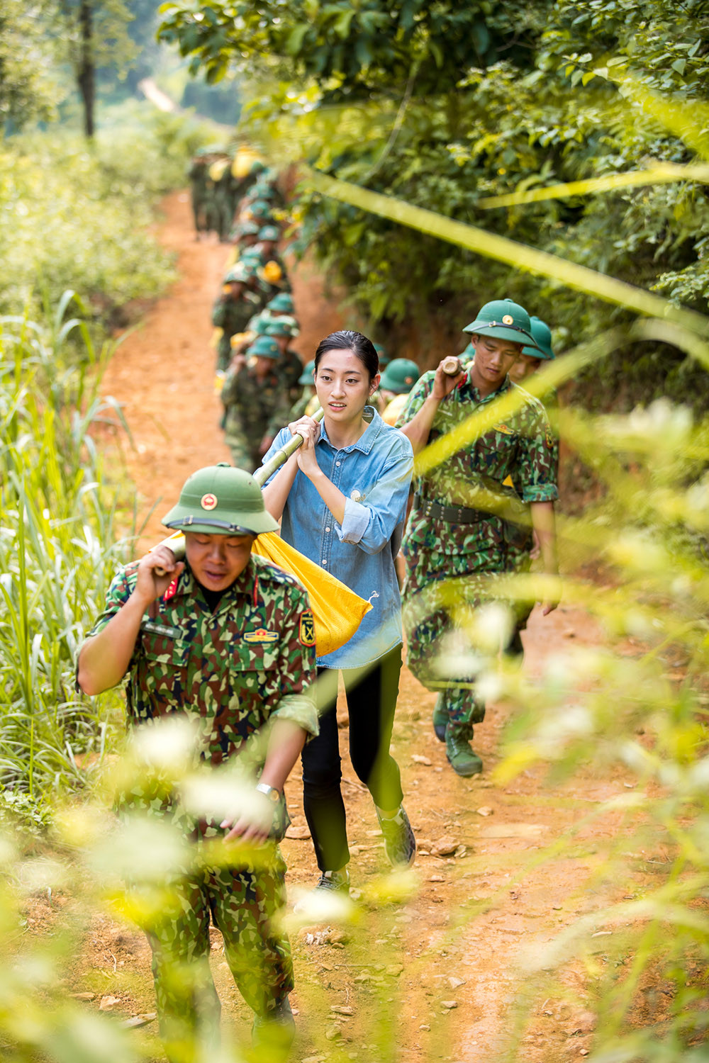Hoa hậu Lương Thùy Linh cùng bộ đội vác vật liệu lên Lũng Lìu làm đường