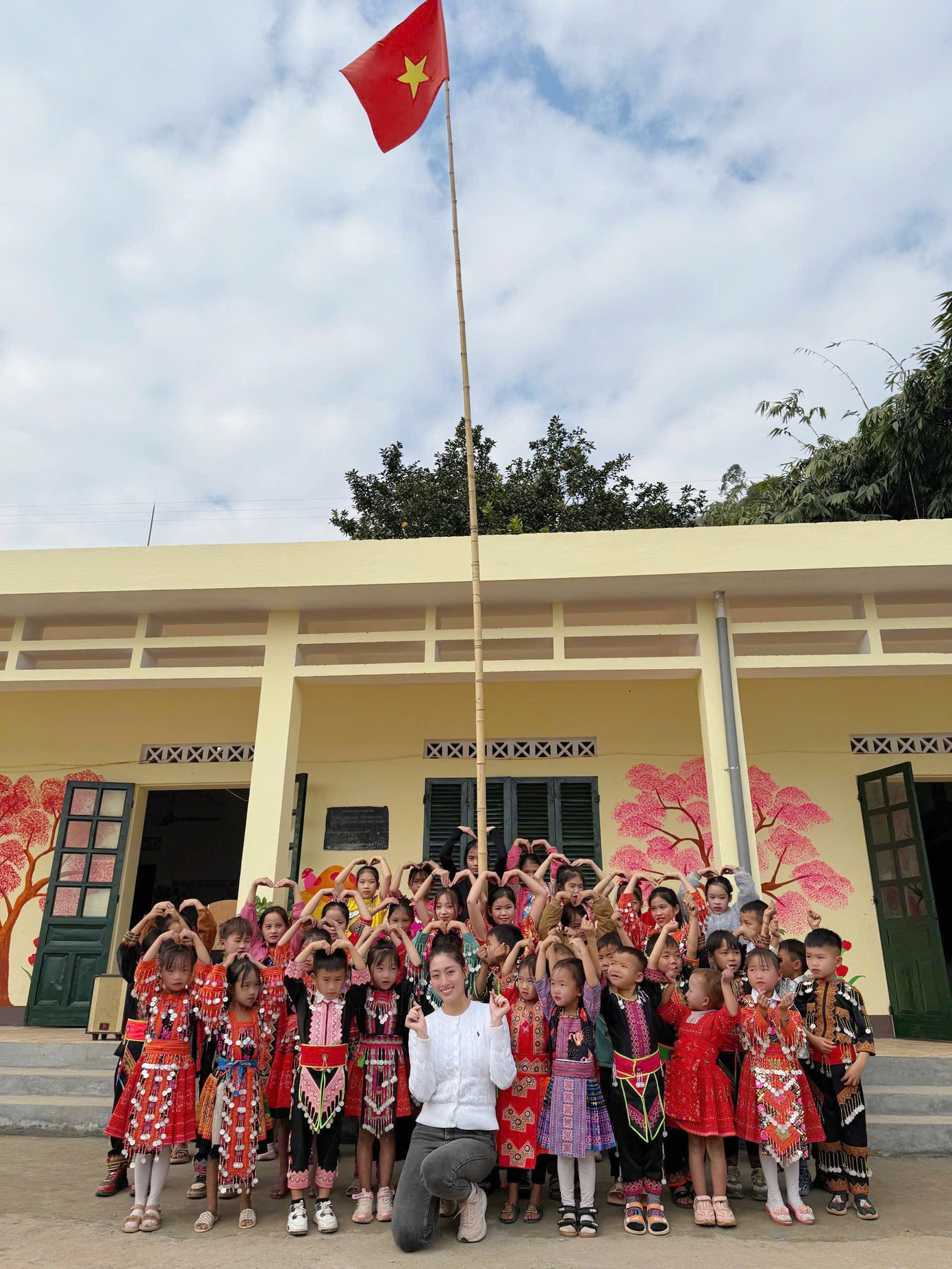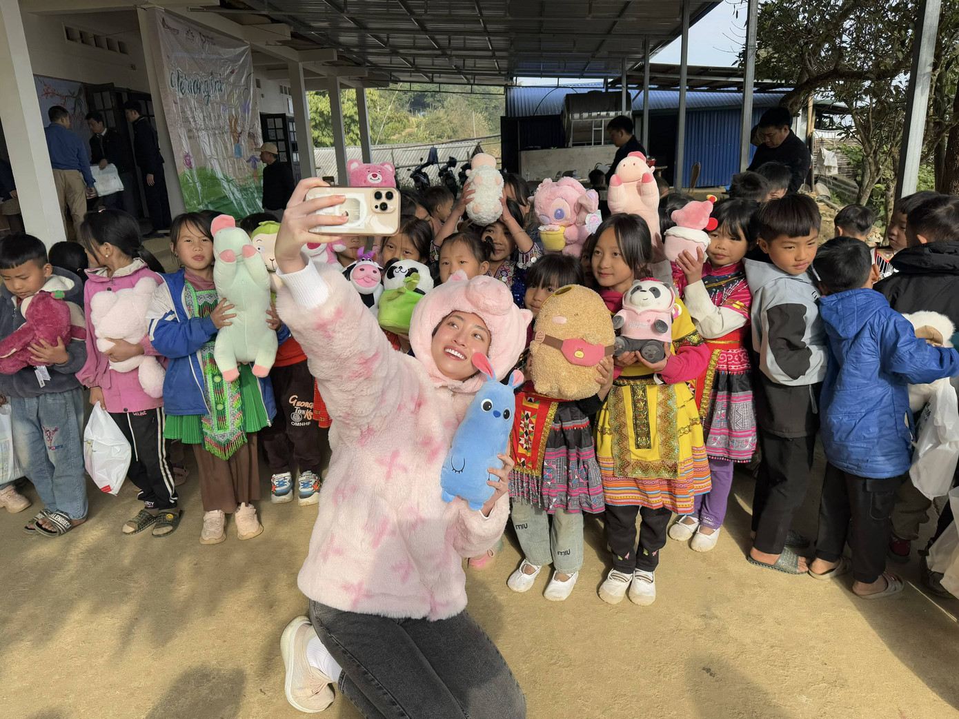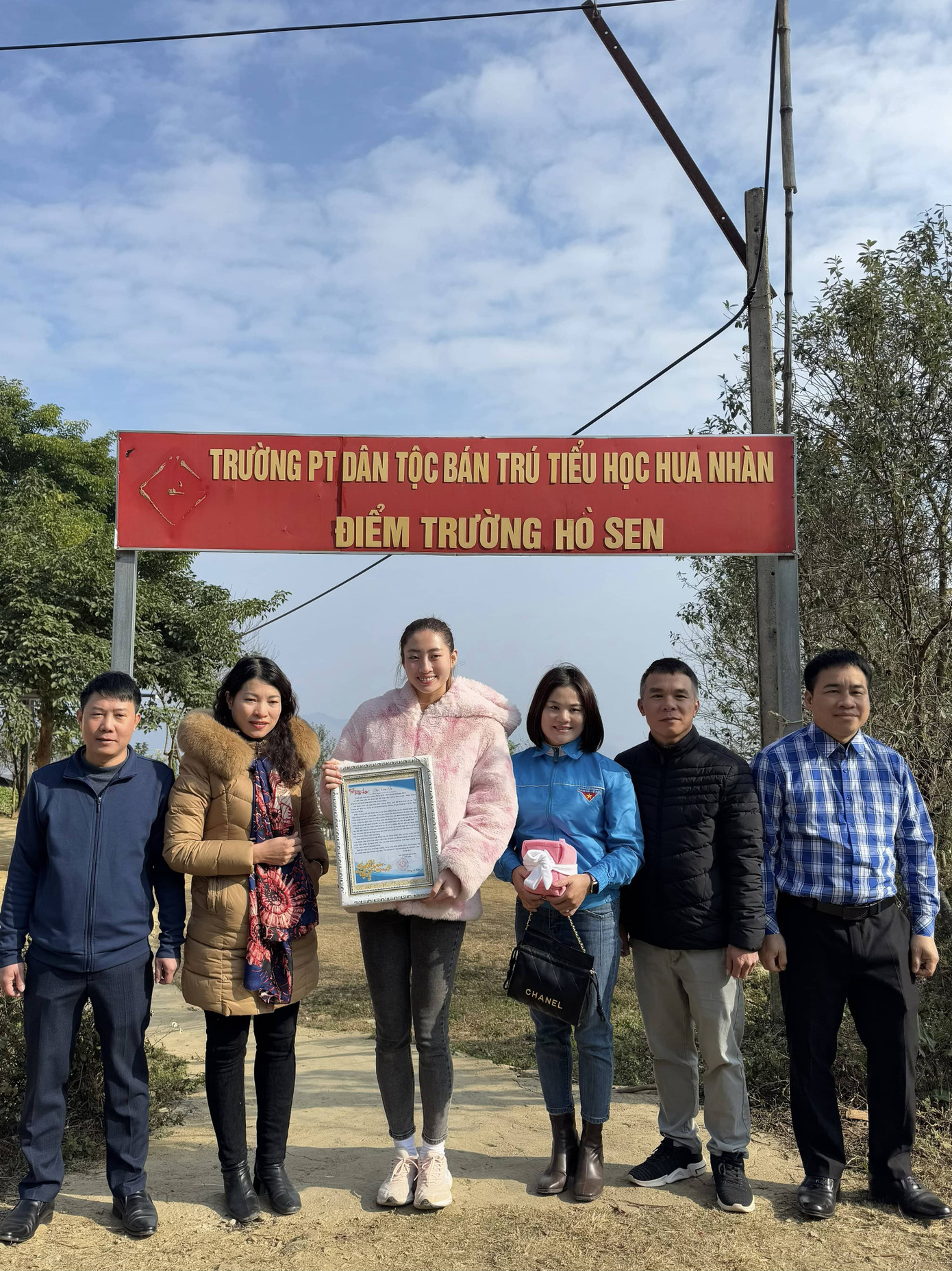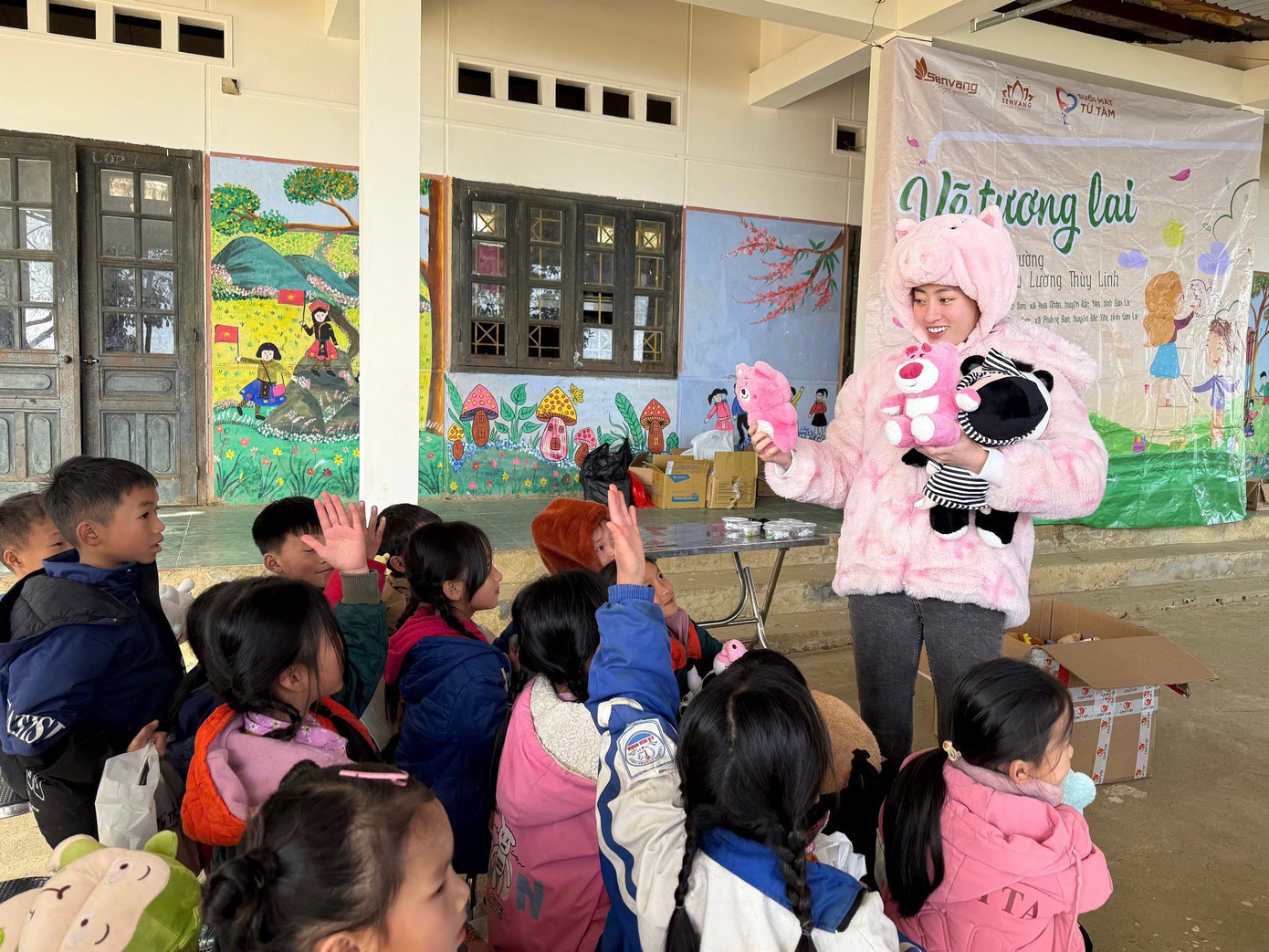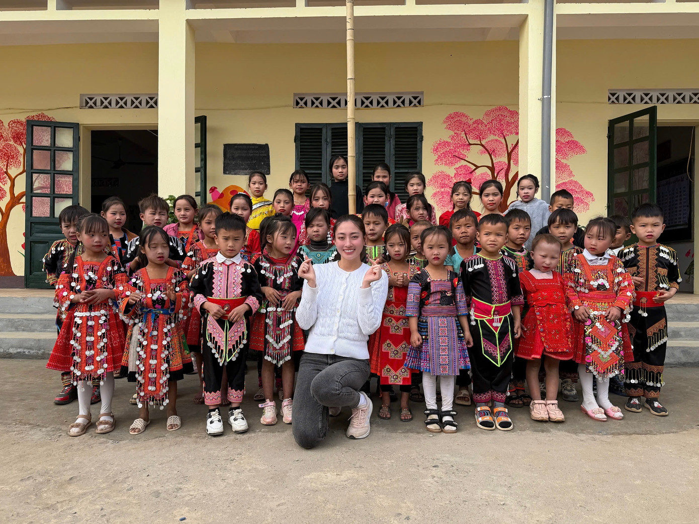 Với 54 học sinh và 5 giáo viên đang giảng dạy, điểm trường bản Hồ Sen là nơi học tập của nhiều trẻ em dân tộc Mông. Mặc dù điều kiện sinh hoạt còn hạn chế, các em luôn giữ tinh thần vui tươi và lòng hiếu học. Lương Thùy Linh đã trực tiếp trao những phần quà thiết thực như tập vở, bút viết, sáp màu, gấu bông cùng nhiều vật dụng học tập khác, cùng vui chơi, hỏi thăm và động viên các em nhỏ có thêm động lực đến trường.