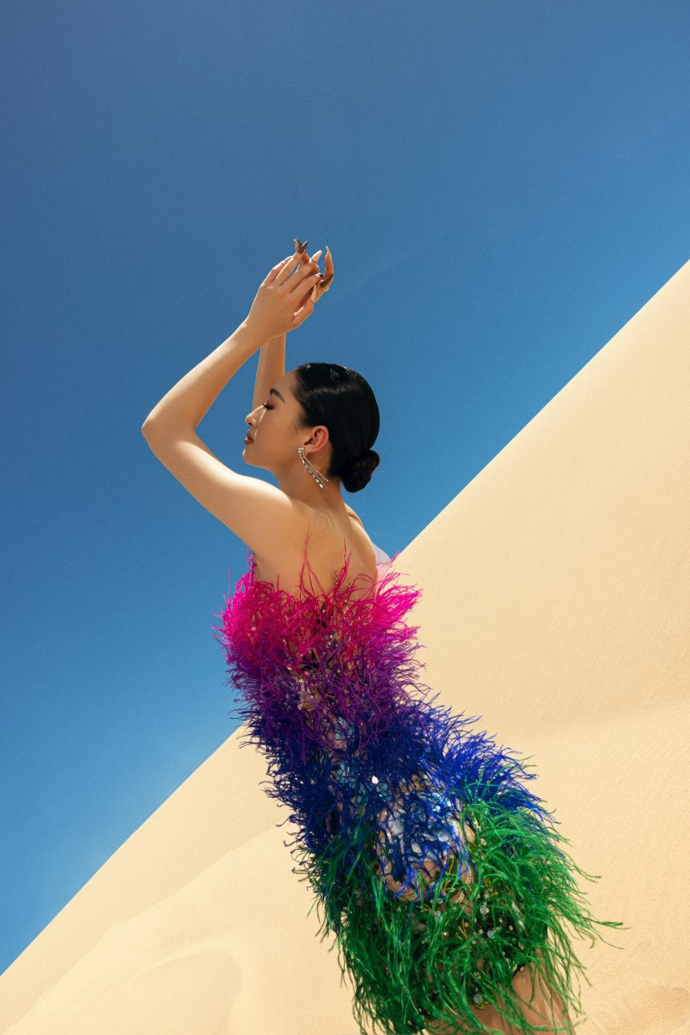 Loạt thiết kế đính lông vũ kỳ công, với độ chuyển màu rực rỡ và chất liệu mềm mại, tung bay trong gió sa mạc tạo nên hiệu ứng thị giác.