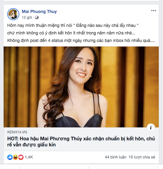 Bản tin Hoa hậu 14/7: Mới đây, báo chí khai thác về chuyện đơi tư của Mai Phương Thuý và cho rằng cô chuẩn bị kết hôn nhưng danh tính của chú rể vẫn được giấu kín. Phản hồi về vấn đề này, Mai Phương Thuý chia sẻ trên trang cá nhân rằng cô không hề có ý định kết hôn trong vòng 5 năm tới.