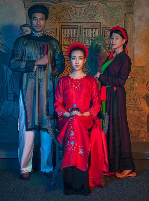 Chất liệu chủ đạo trong bộ sưu tập là gấm, lụa, the, đũi... với các màu nâu non, nâu đỏ, xanh lá, hồng đất.