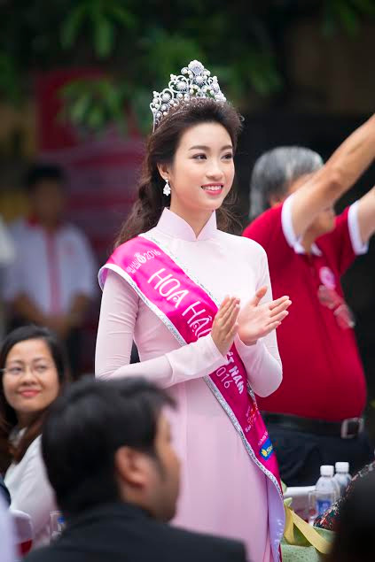 Sáng nay (12/9), Hoa hậu Đỗ Mỹ Linh có mặt từ sớm để dự buổi lễ khai giảng năm học mới của ngôi trường cô đang theo học - Đại học Ngoại thương.