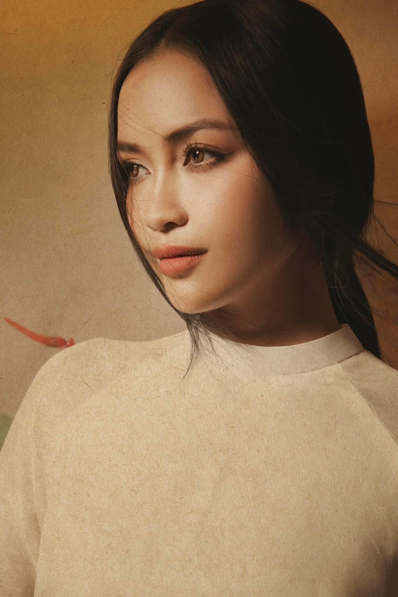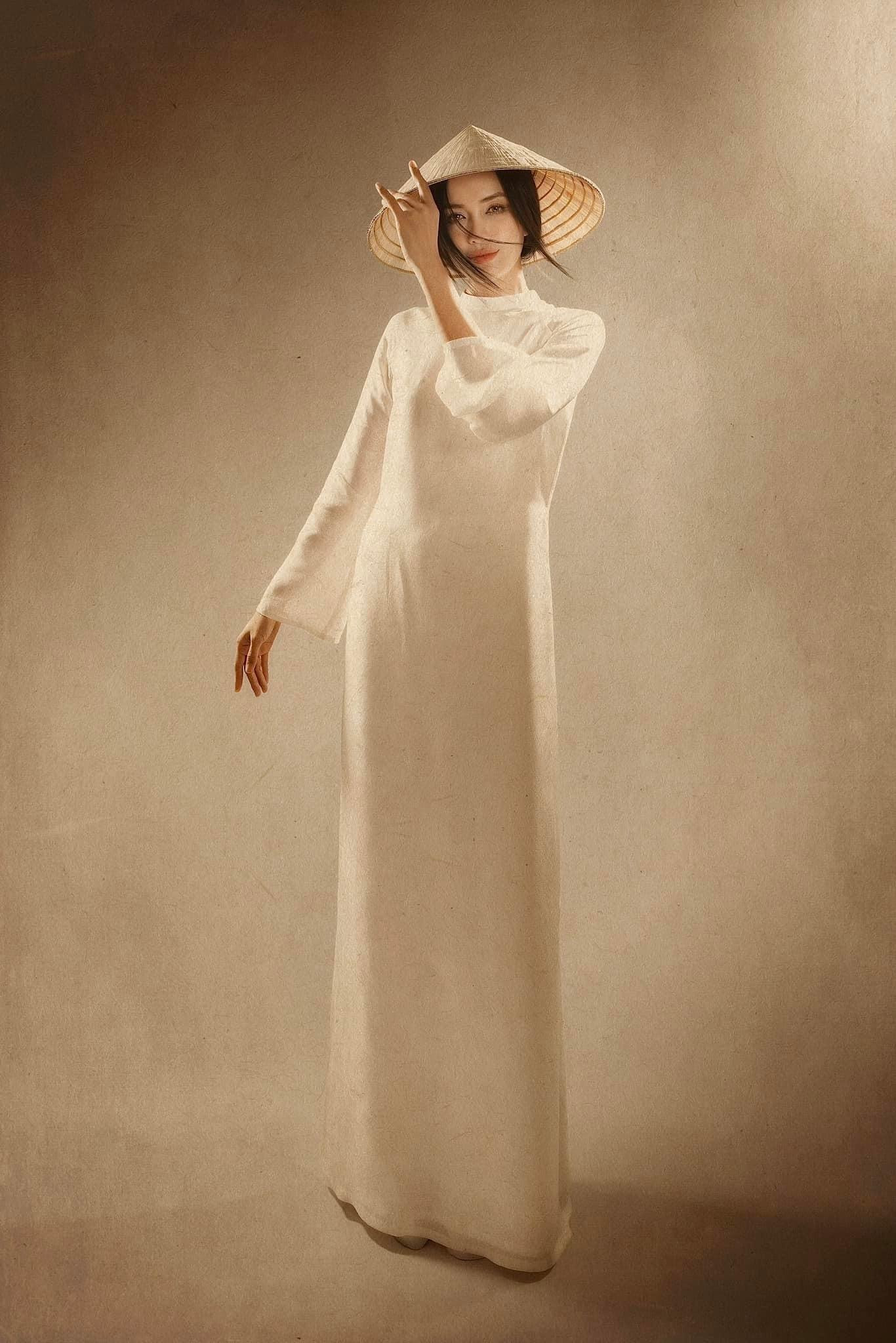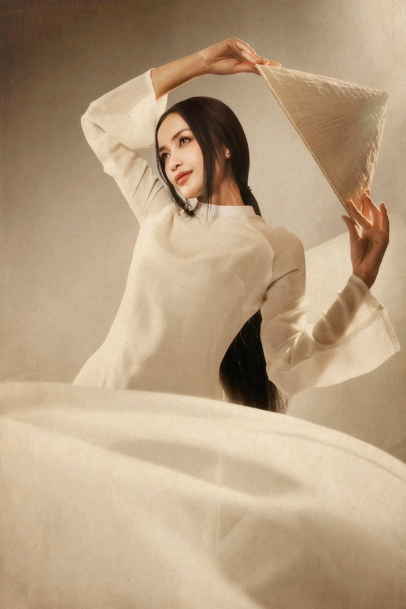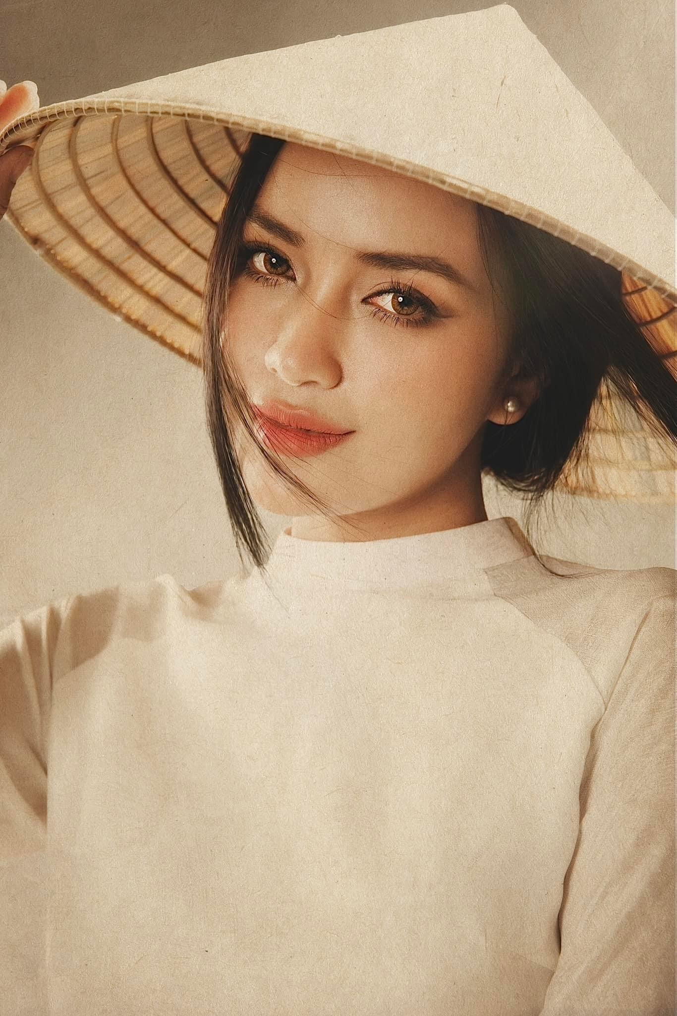 Bộ ảnh được chụp với concept vô cùng đơn giản, phong cách hoài cổ, rất hợp với không khí Tết Nguyên đán đang tới gần. Hoa hậu Ngọc Châu đội nón lá, mặc áo dài lụa trắng tinh khôi.
