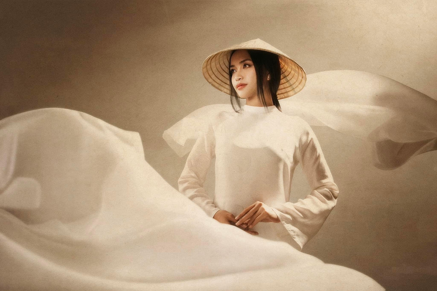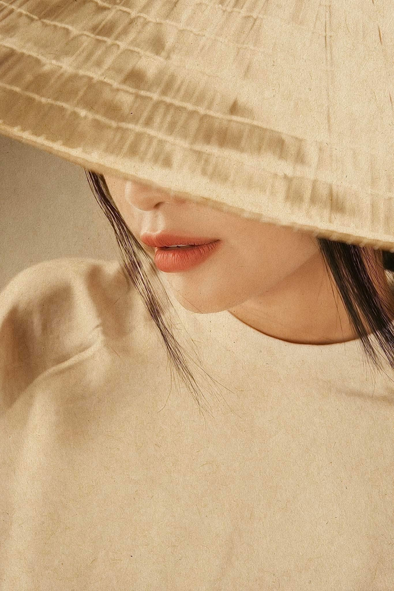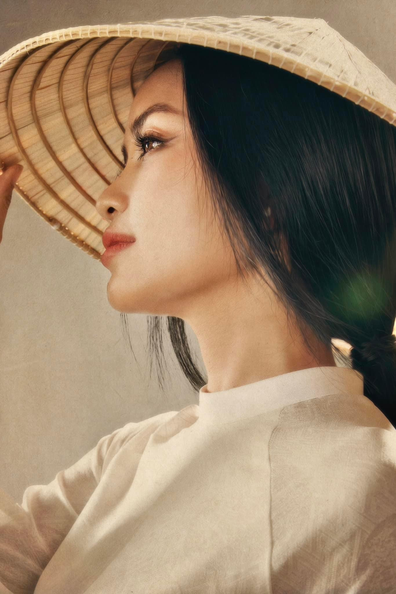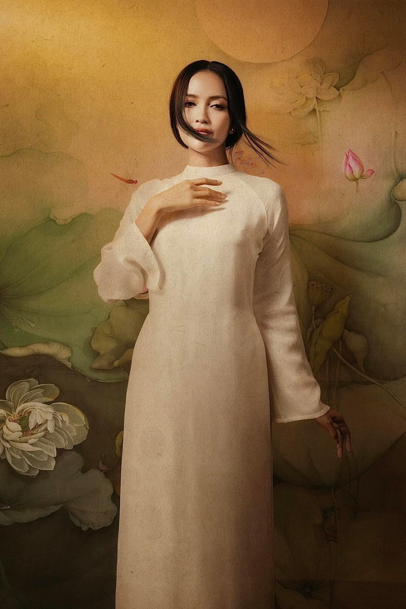 Bộ ảnh được chụp với concept vô cùng đơn giản, phong cách hoài cổ, rất hợp với không khí Tết Nguyên đán đang tới gần. Hoa hậu Ngọc Châu đội nón lá, mặc áo dài lụa trắng tinh khôi.