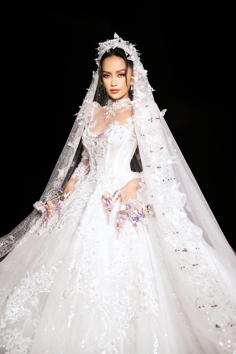 | Chiếc váy cưới điểm xuyến nhiều cánh bướm mềm mại của Hoa hậu Ngọc Châu giúp nàng hậu trông như một "nàng tiên hoa". |
