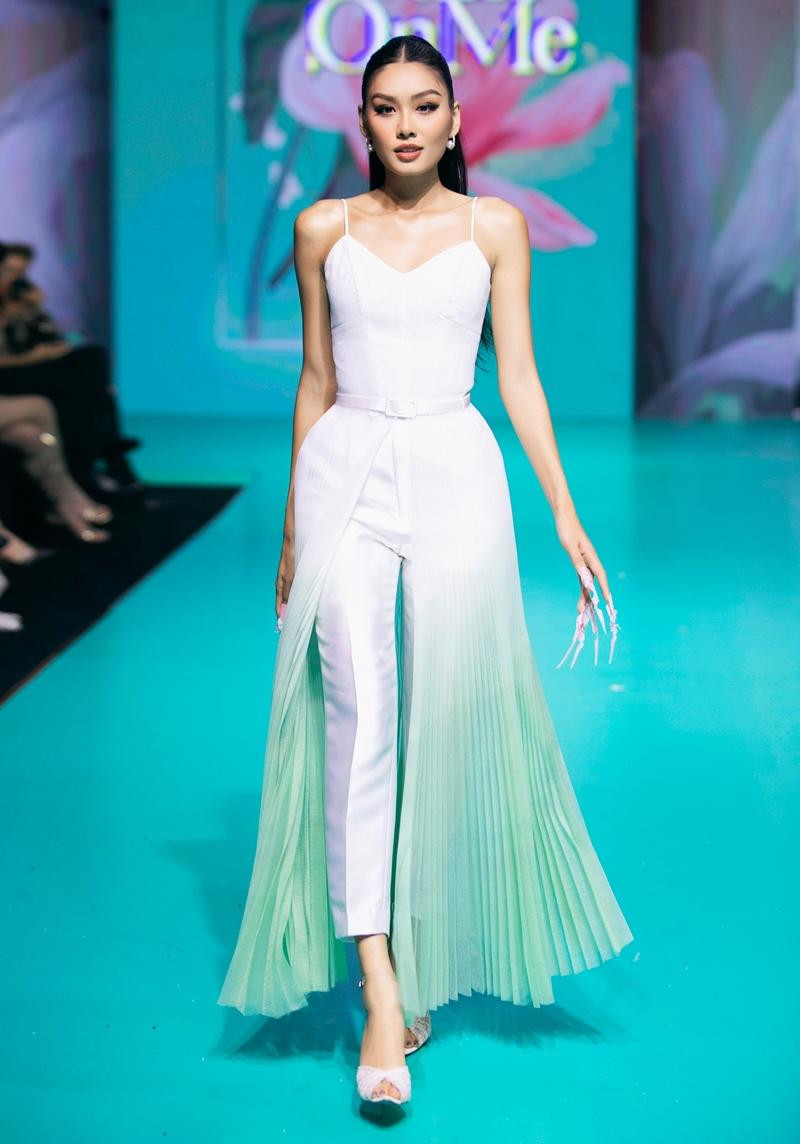 Sau đó, Top 3 Hoa hậu Hoàn Vũ Việt Nam 2022 lần lượt làm vedette của các bộ sưu tập với đề tài khác nhau. Á hậu Thảo Nhi Lê trình diễn BST Văn phòng hiện đại với phong cách sôi nổi, năng động và đeo bộ nail được xử lý màu trơn với những họa tiết đơn giản.