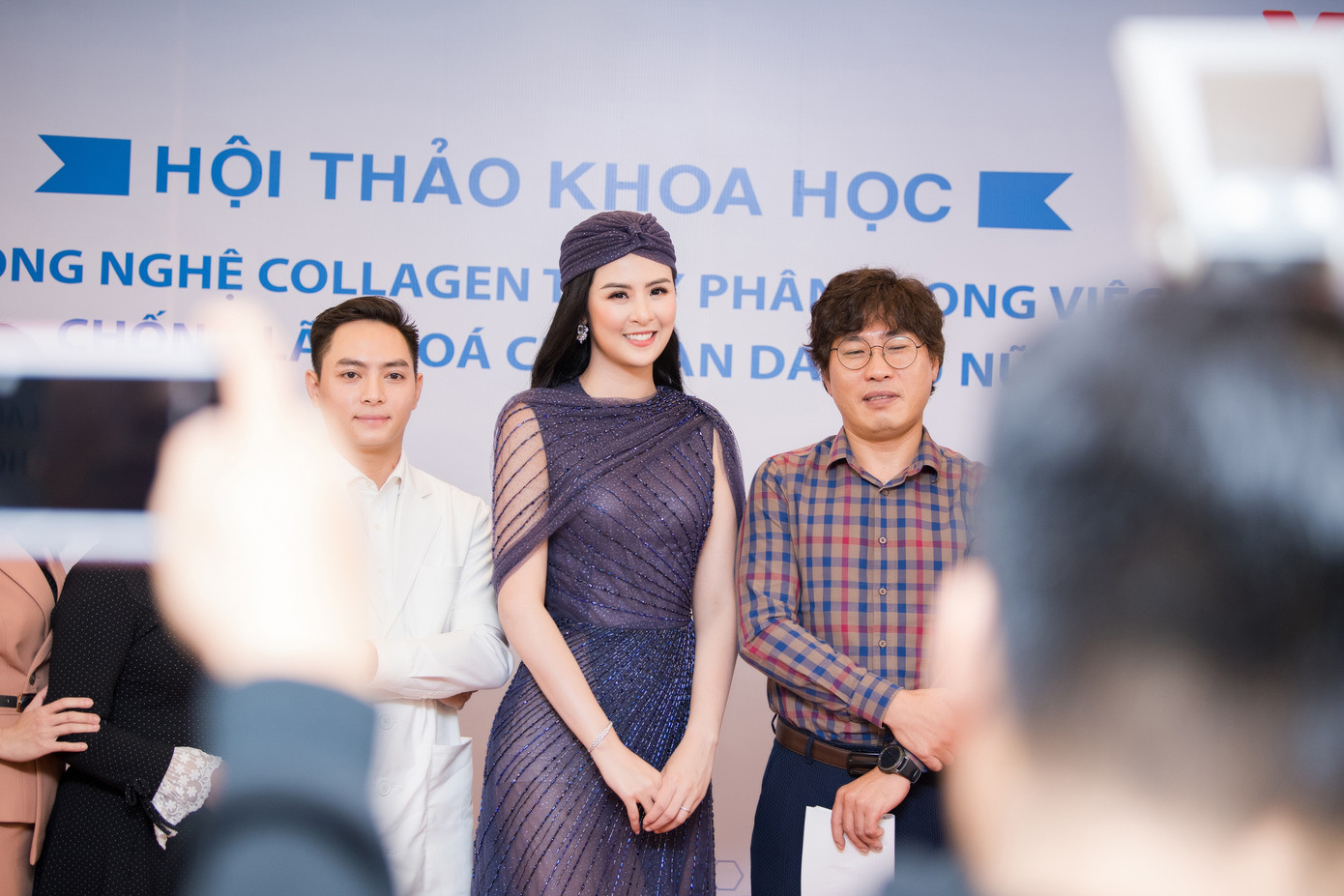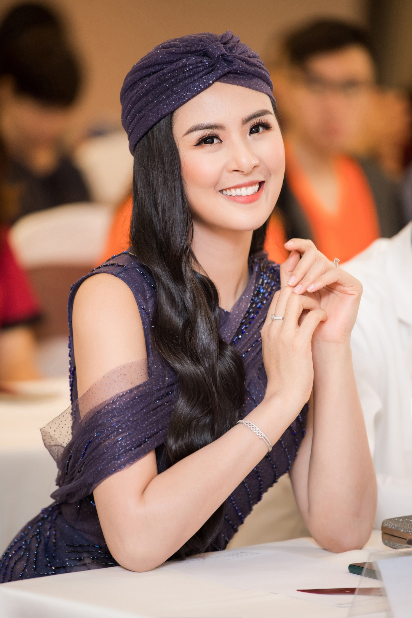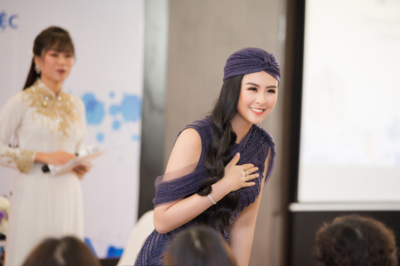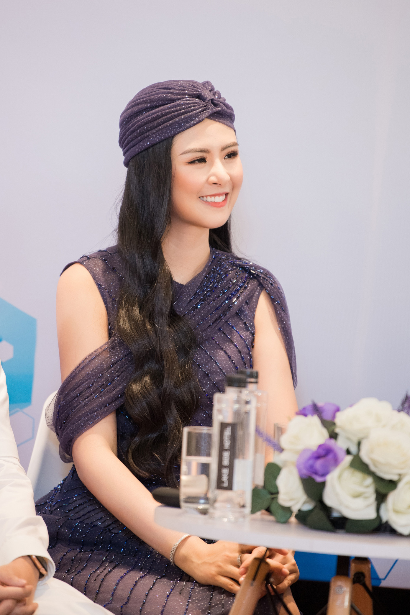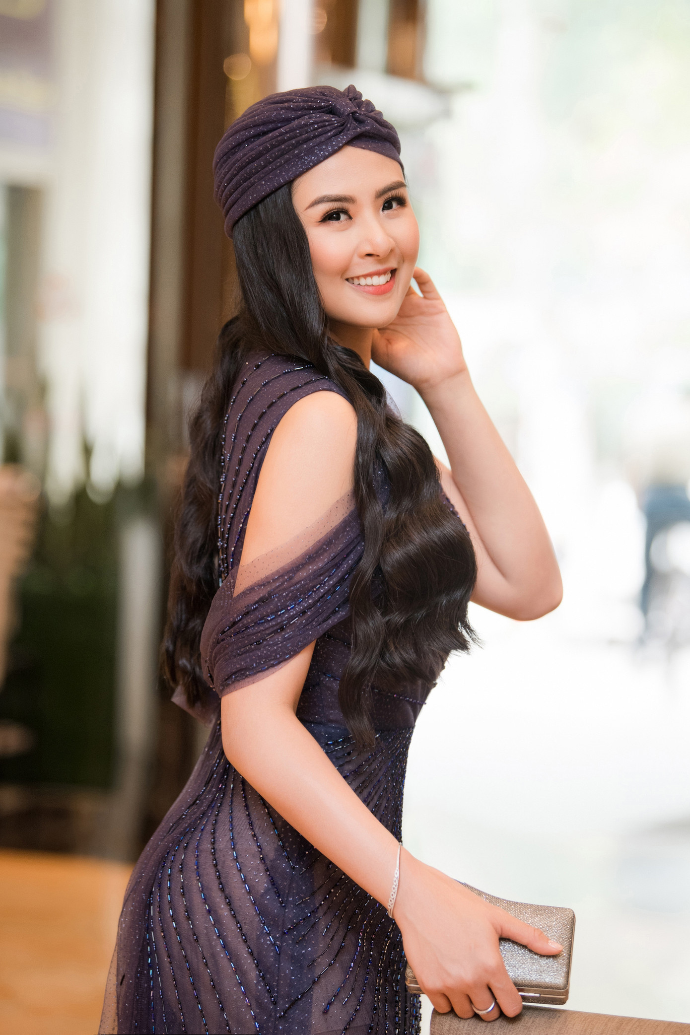 Hoa hậu Ngọc Hân xuất hiện lộng lẫy và quyến rũ tại một sự kiện làm đẹp ở Hà Nội cuối tuần qua trong bộ váy dạ hội màu tím chất liệu xuyên thấu gợi cảm.
