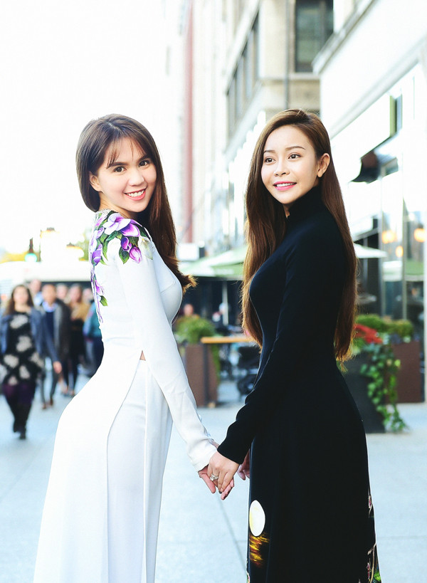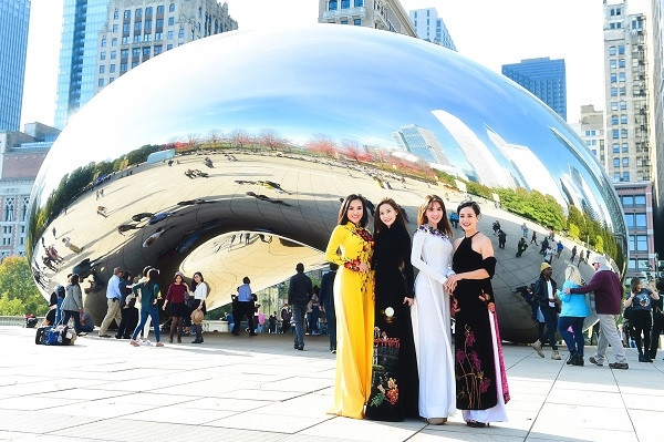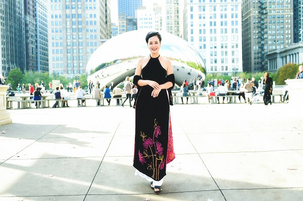 Chiếc áo dài in họa tiết Hồ Gươm này cũng từng được chị mặc trong đêm chung kết cuộc thi Mrs Vietnam Áo Dài in USA và góp phần mang lại chiến thắng cho nữ doanh nhân tài sắc này.