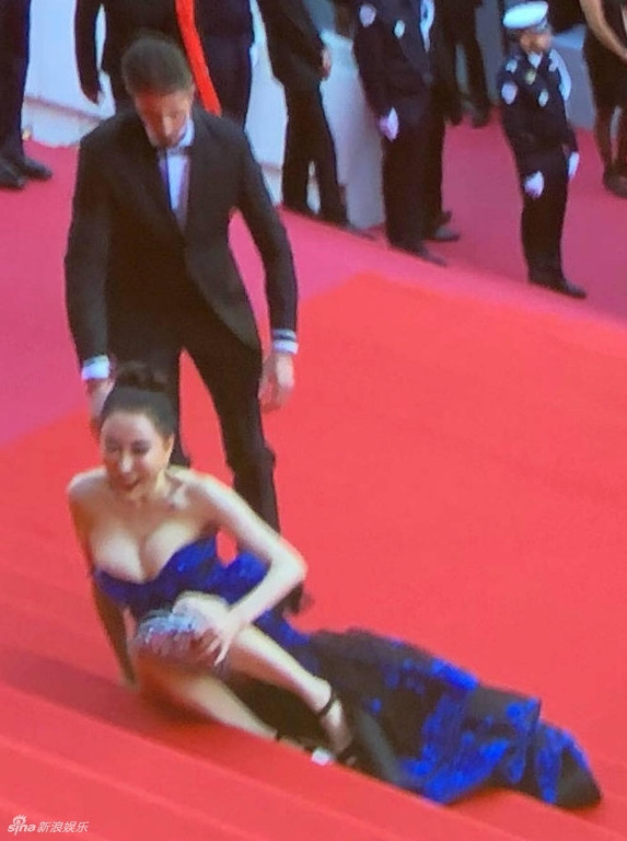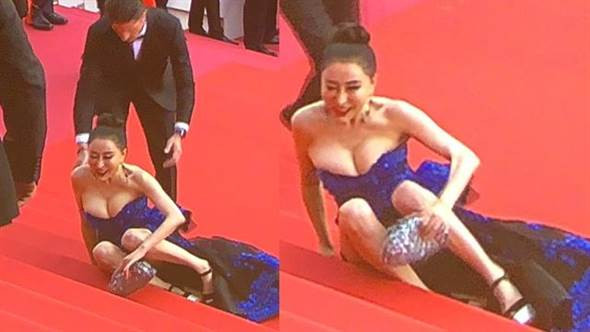 Nhân vật chính là Hoa hậu Quý bà Trung Quốc Hình Tiểu Hồng. Cô diện bộ đầm xanh đen cúp ngực đến Cannes 2018, rồi bất ngờ ngã sõng soài lúc bước lên cầu thang.
