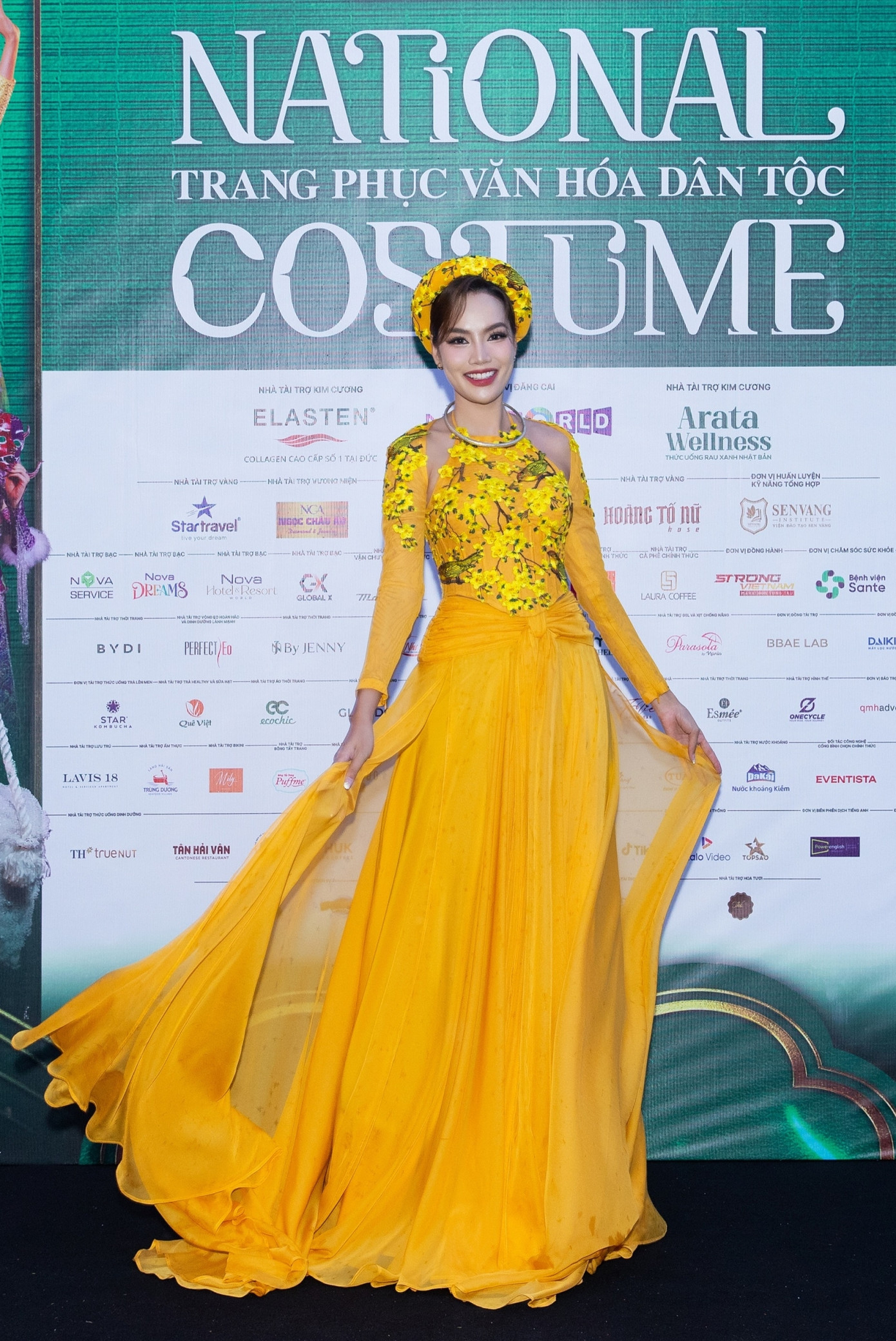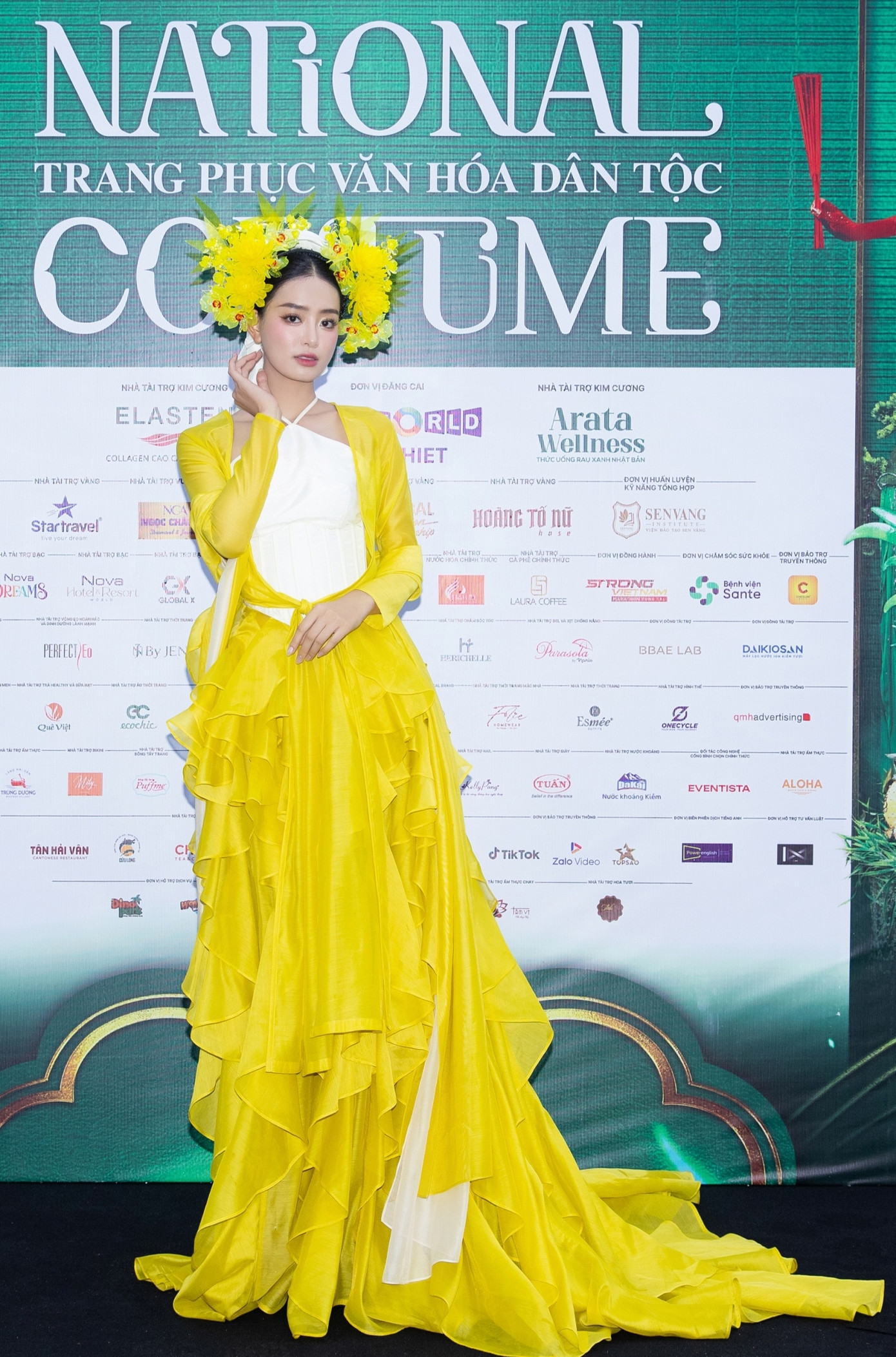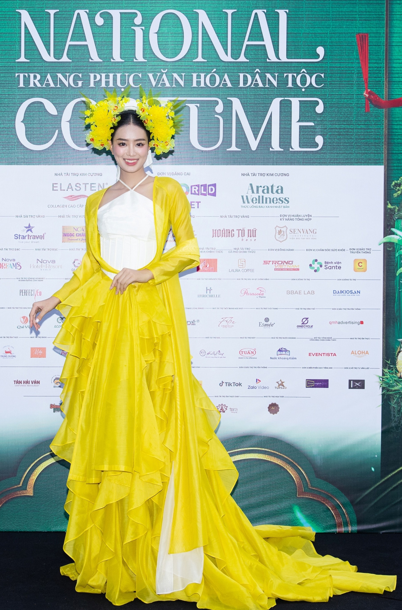 Á hậu Bùi Khánh Linh nổi bật với sắc vàng trang phục Bắc bộ truyền thống. Bên cạnh đó, phụ kiện tóc hoa mai cách điệu cũng gây ấn tượng.