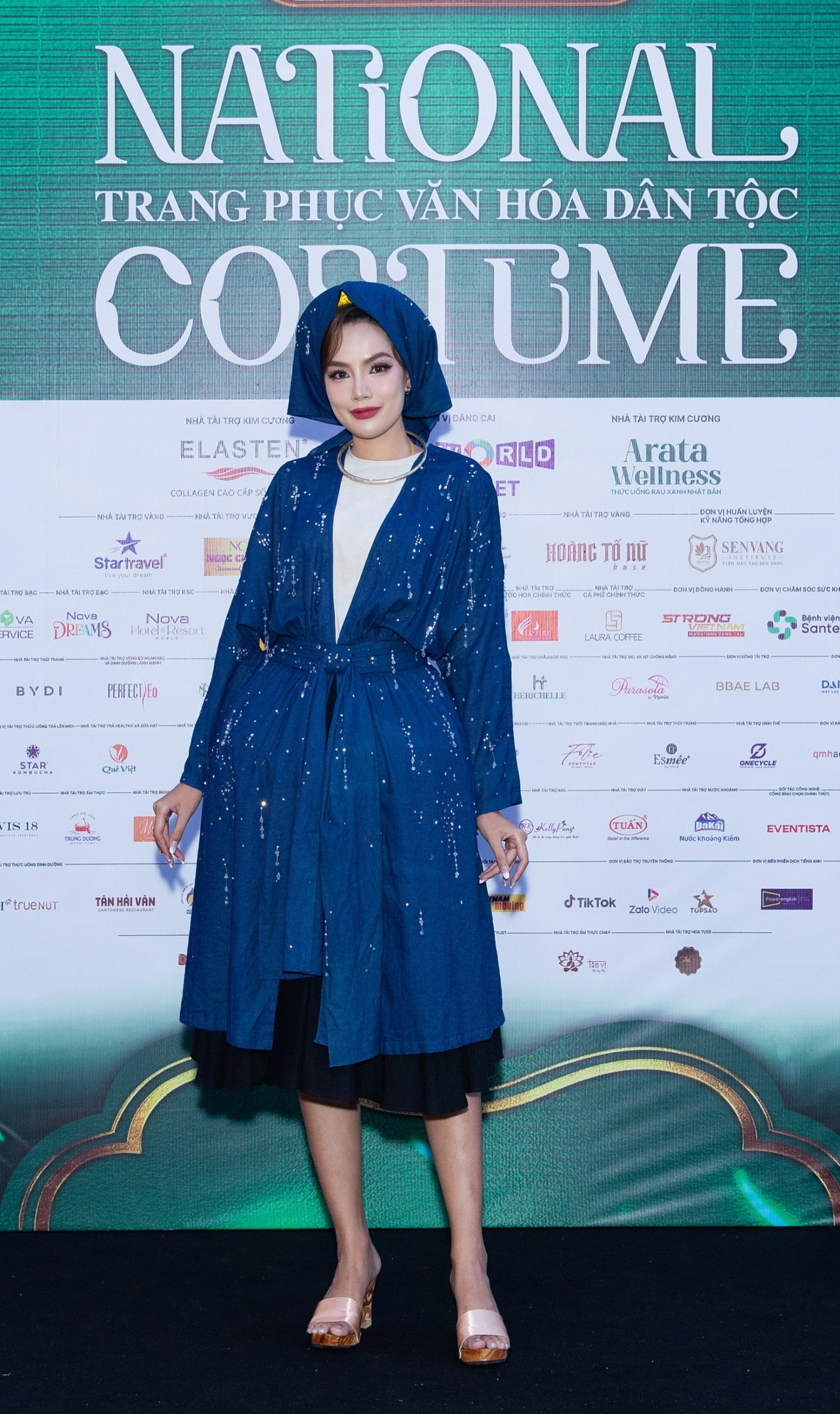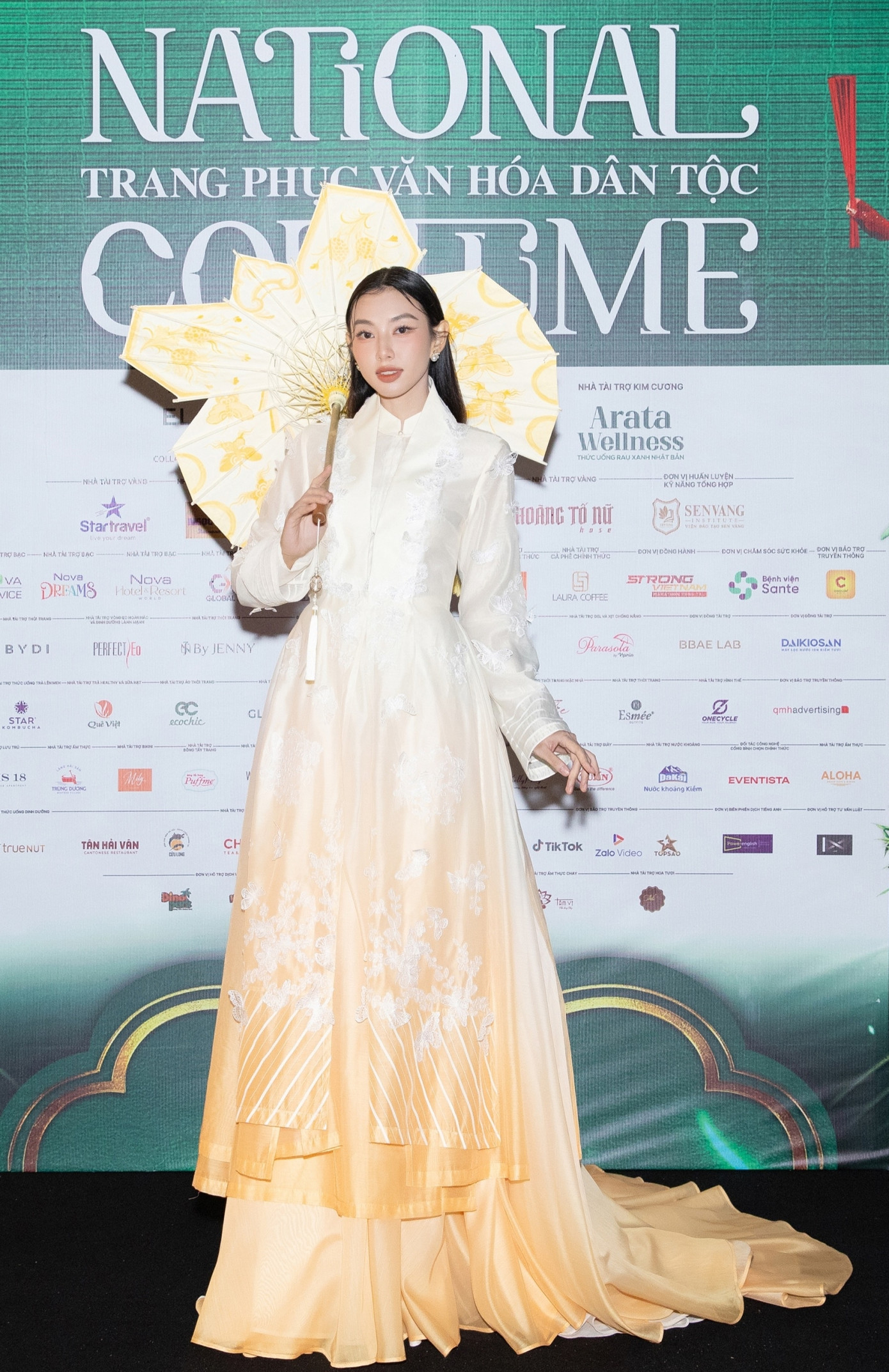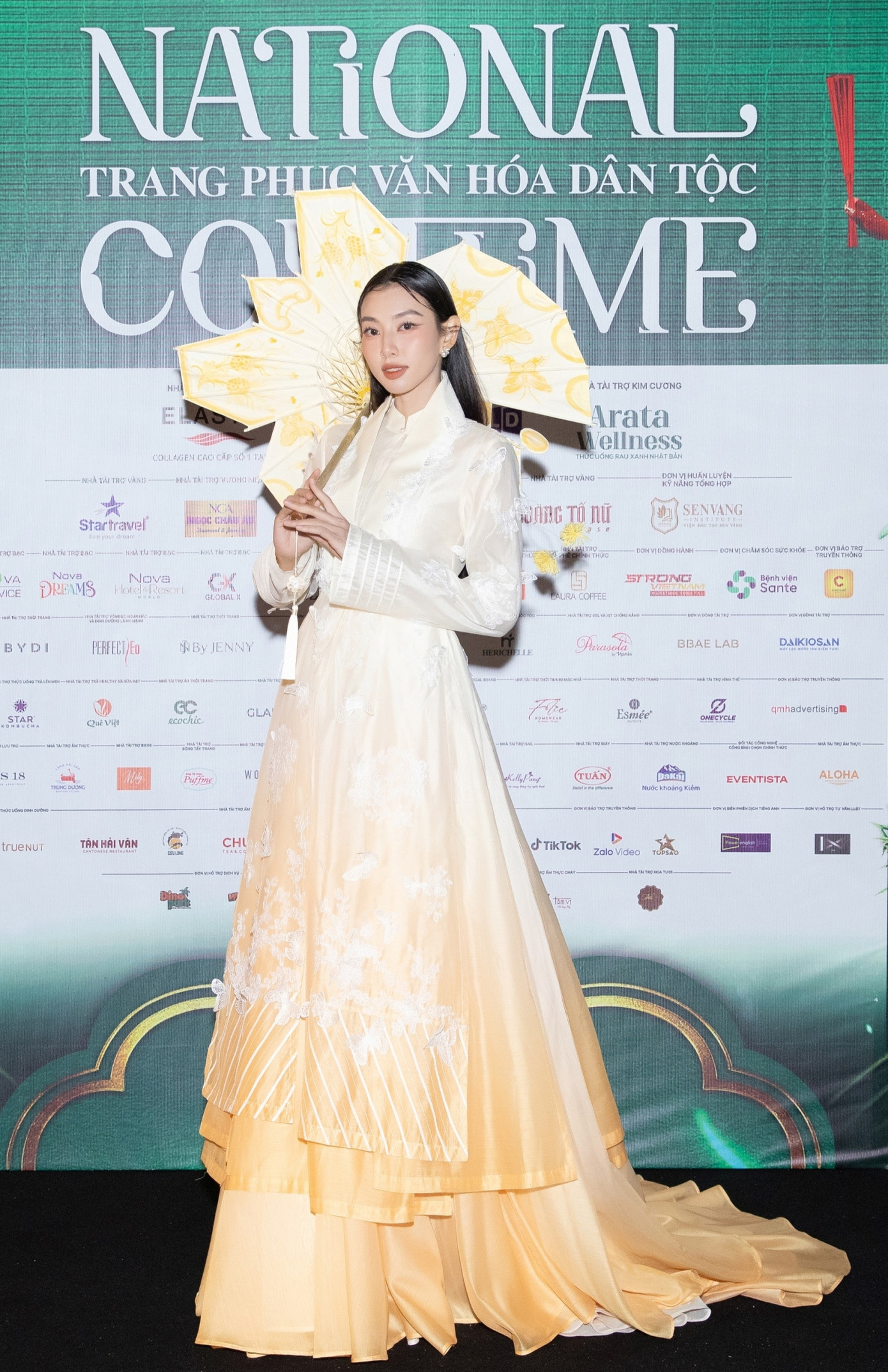 Á hậu Bùi Khánh Linh nổi bật với sắc vàng trang phục Bắc bộ truyền thống. Bên cạnh đó, phụ kiện tóc hoa mai cách điệu cũng gây ấn tượng.