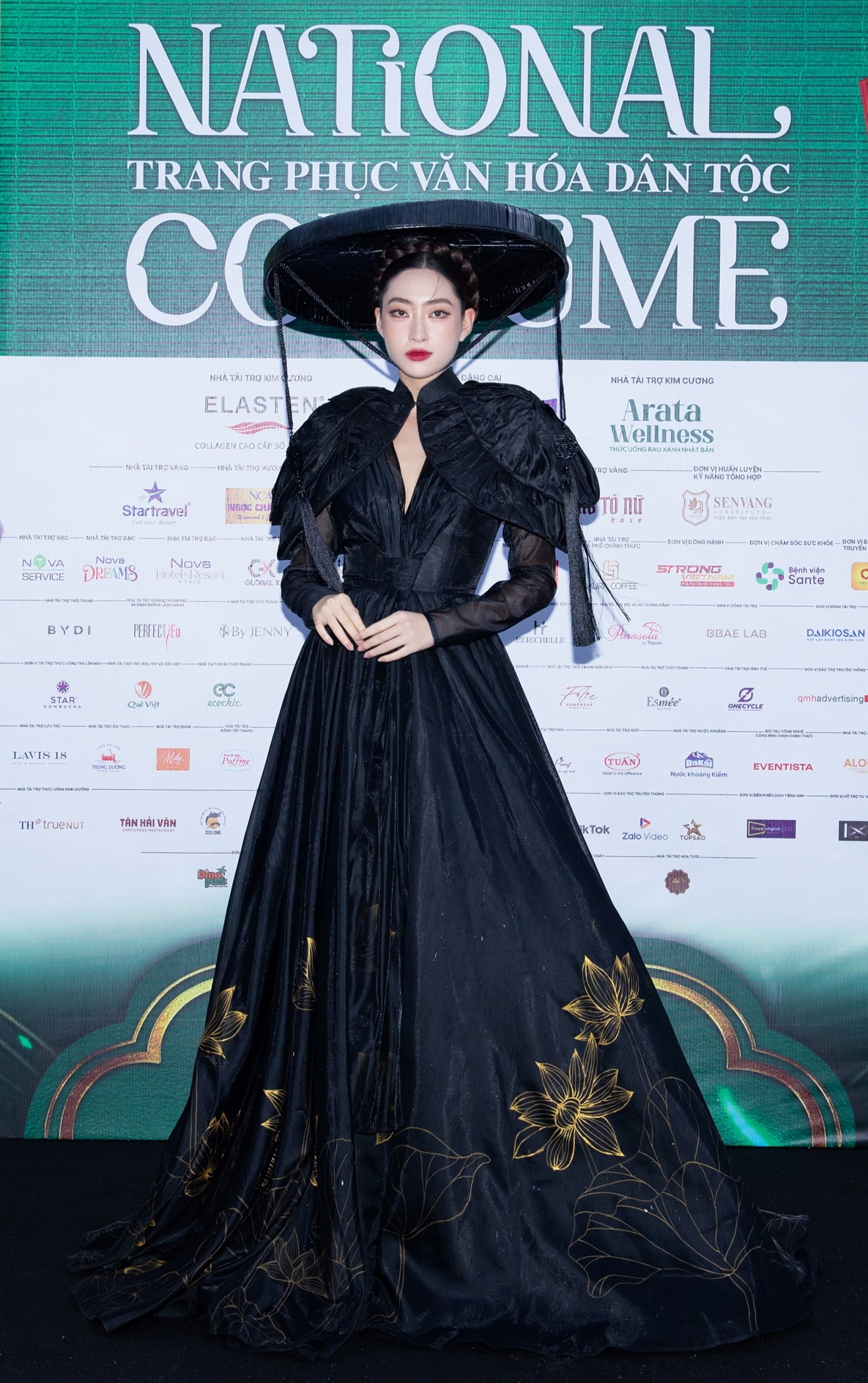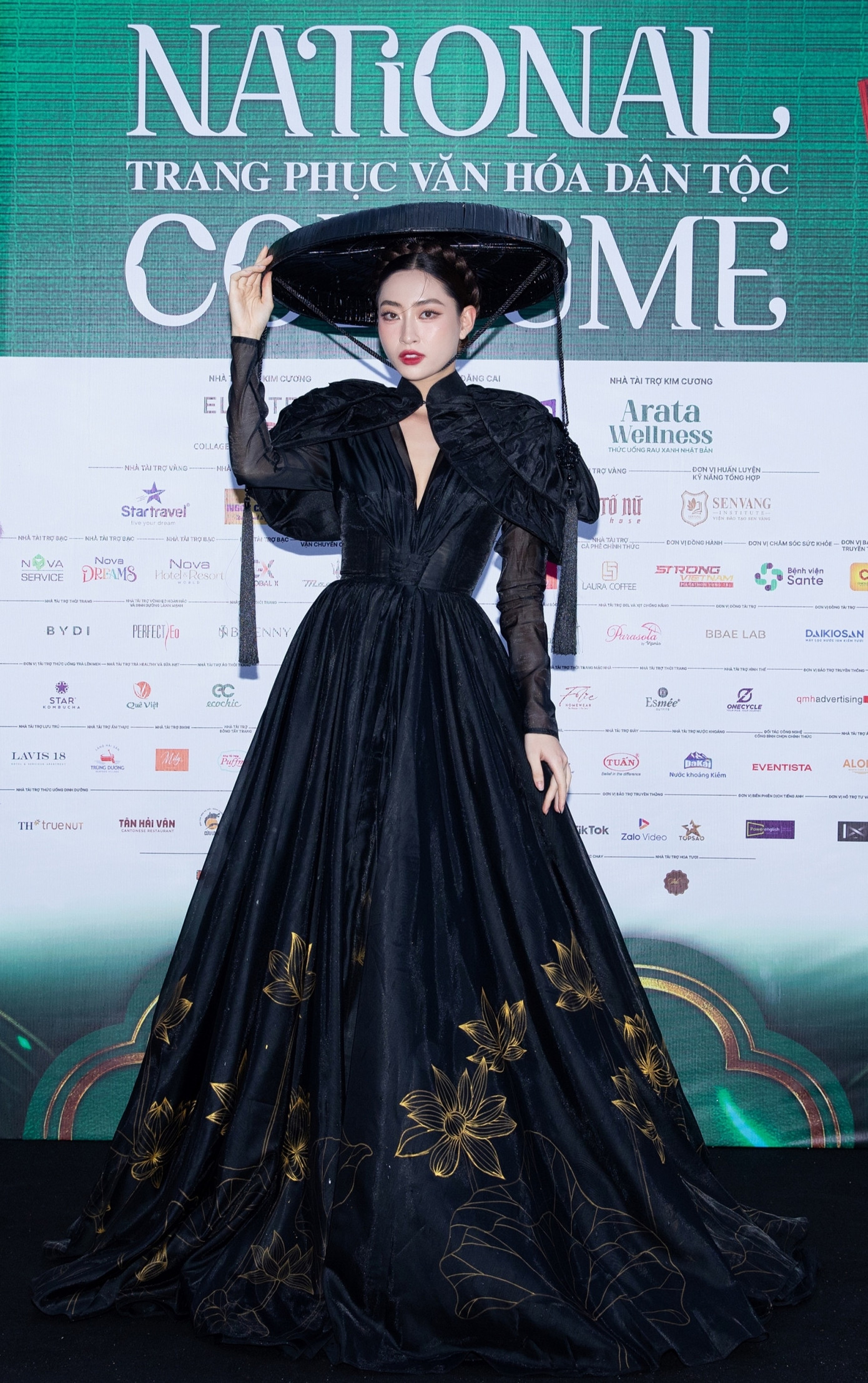 Hoa hậu Lương Thùy Linh mang vẻ đẹp đậm chất phụ nữ Bắc bộ với áo tứ thân và nón quai thao, sắc đen bí ẩn, quyến rũ.