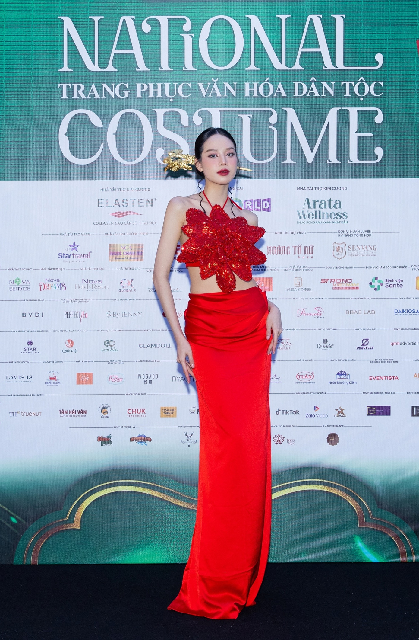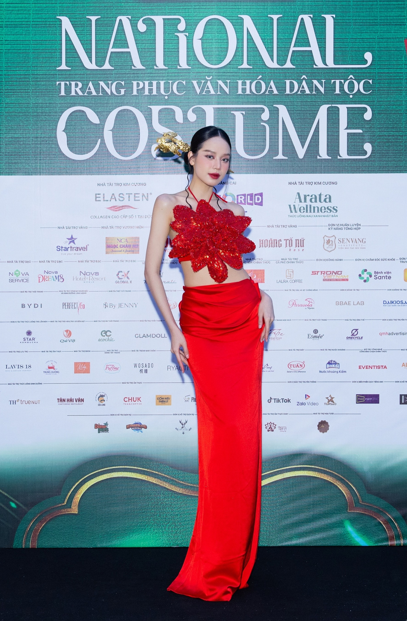 Với thế mạnh chiều cao, Hoa hậu Bảo Ngọc lựa chọn thiết kế tôn dáng. Trang phục có nhiều họa tiết đậm chất Việt Nam.