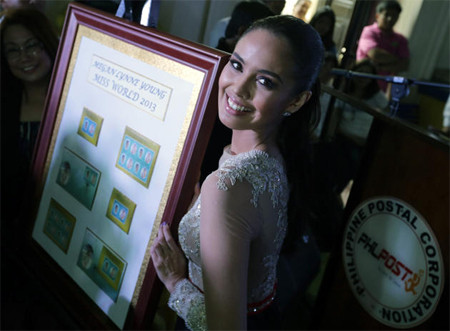 Đương kim Hoa hậu thế giới rạng ngời khi xuất hiện tại Manila, Philippines và cầm trên tay bộ tem của mình. Những con tem mang hình ảnh Megan Young lúc cô đăng quang ngôi vị HHTG vào ngày 28/9/2013