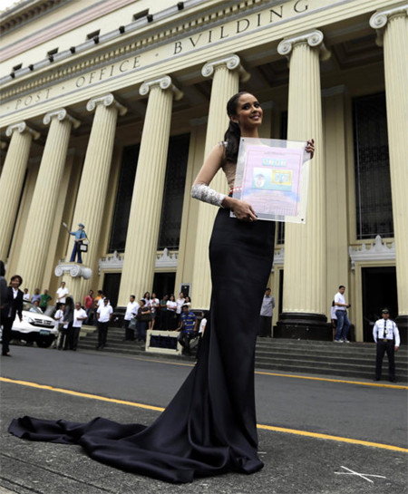 Megan Young cầm trên tay những con tem có in hình cô, hình ảnh của hoa hậu 24 tuổi đã xuất hiện trên 80.000 con tem thông thường và 7000 con tem lưu niệm