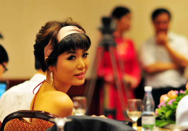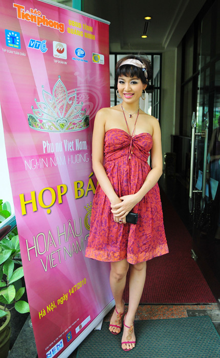 Hoa hậu Thu Thủy trong 'vòng vây' của các phóng viên.