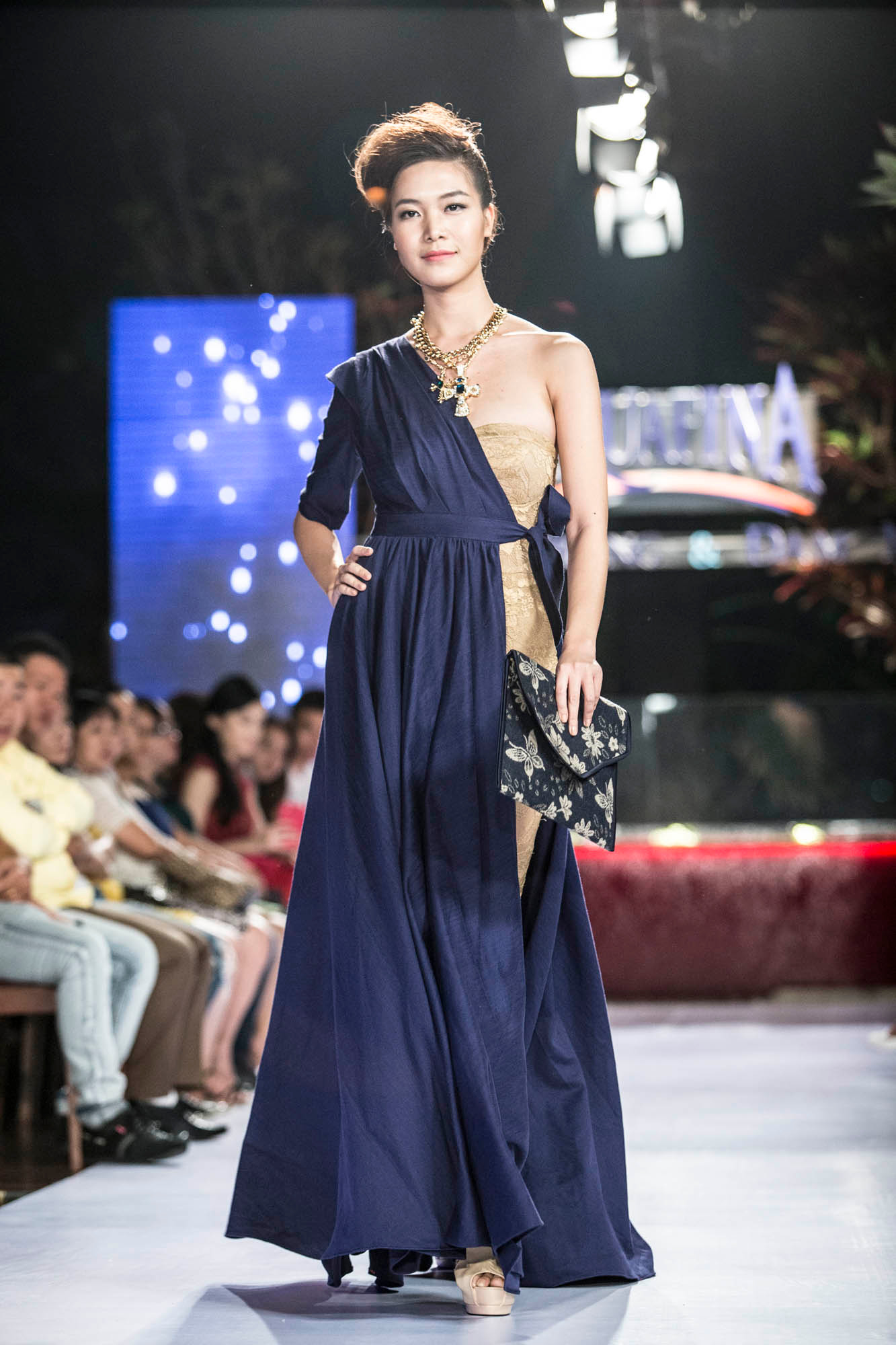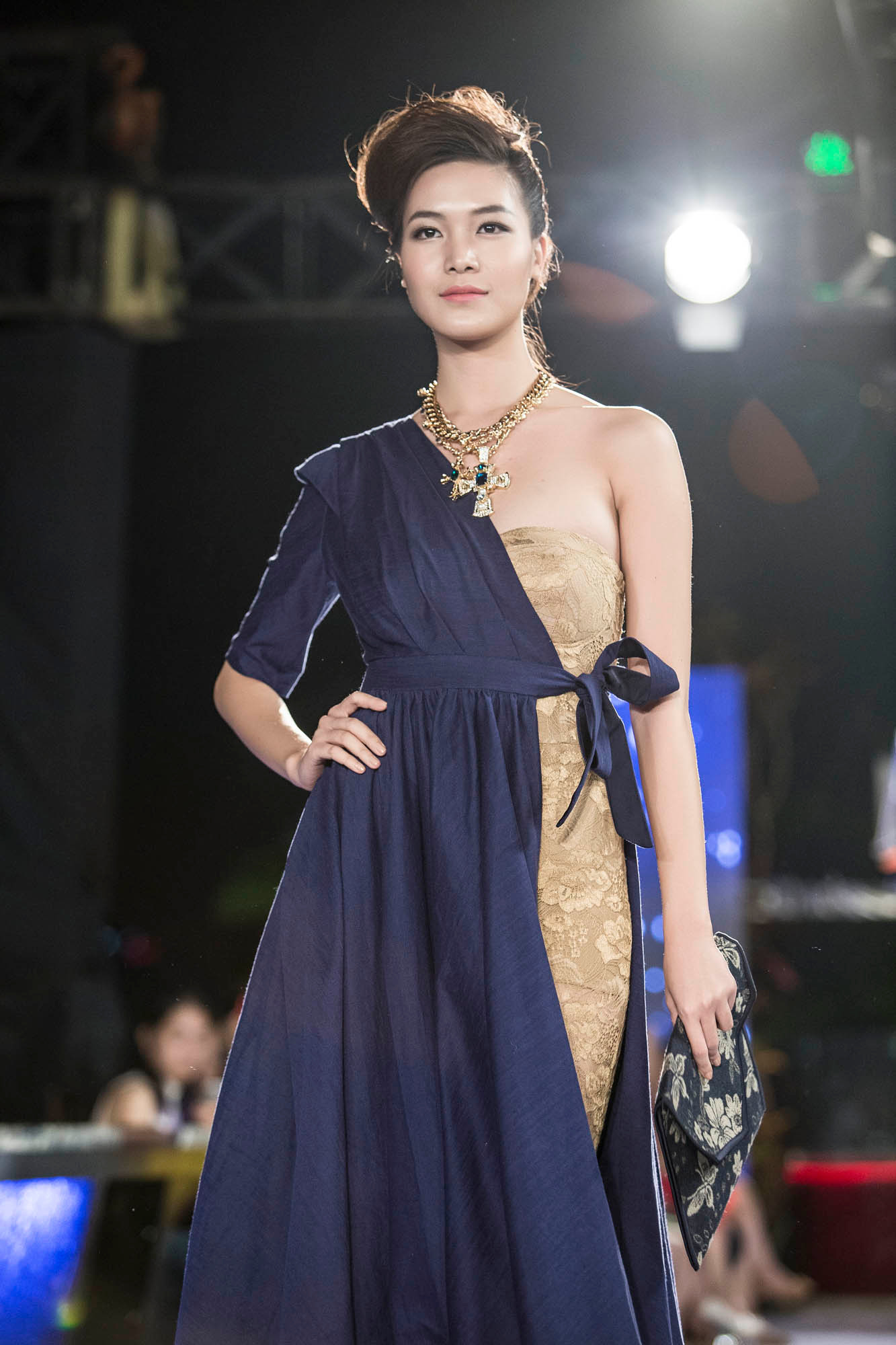 Xuất hiện trong chương trình tối qua, Thùy Dung trở thành người mẫu vedette, trình diễn các thiết kế của NTK Cao Minh Tiến. Trong bộ váy dạ hội được thiết kế lệch tà độc đáo, cùng lớp ren màu vàng bên trong, hoa hậu khoe vai trần gợi cảm và đôi chân dài bất tận.