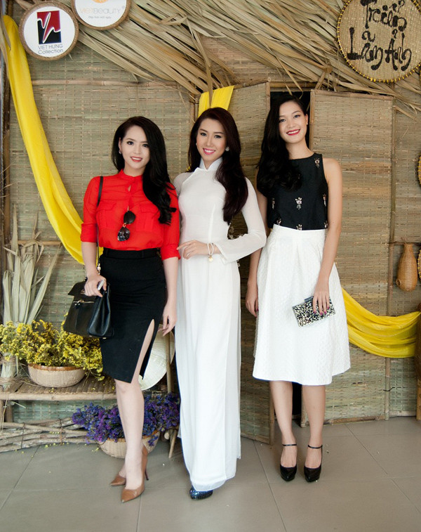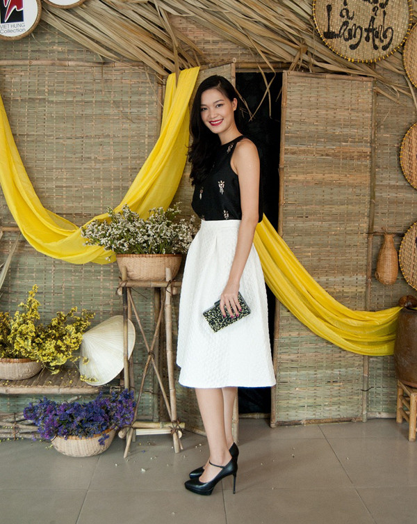 Vốn sở hữu nhan sắc ngày càng mặn mà, cộng thêm chiều cao ‘khủng’ nên Thùy Dung luôn nổi bật khi tạo dáng bên cạnh dàn người đẹp. Thùy Dung ăn mặc khá giản dị với chân váy xòe màu trắng, kết hợp cùng áo đen in họa tiết, mái tóc buông xõa gợi cảm.