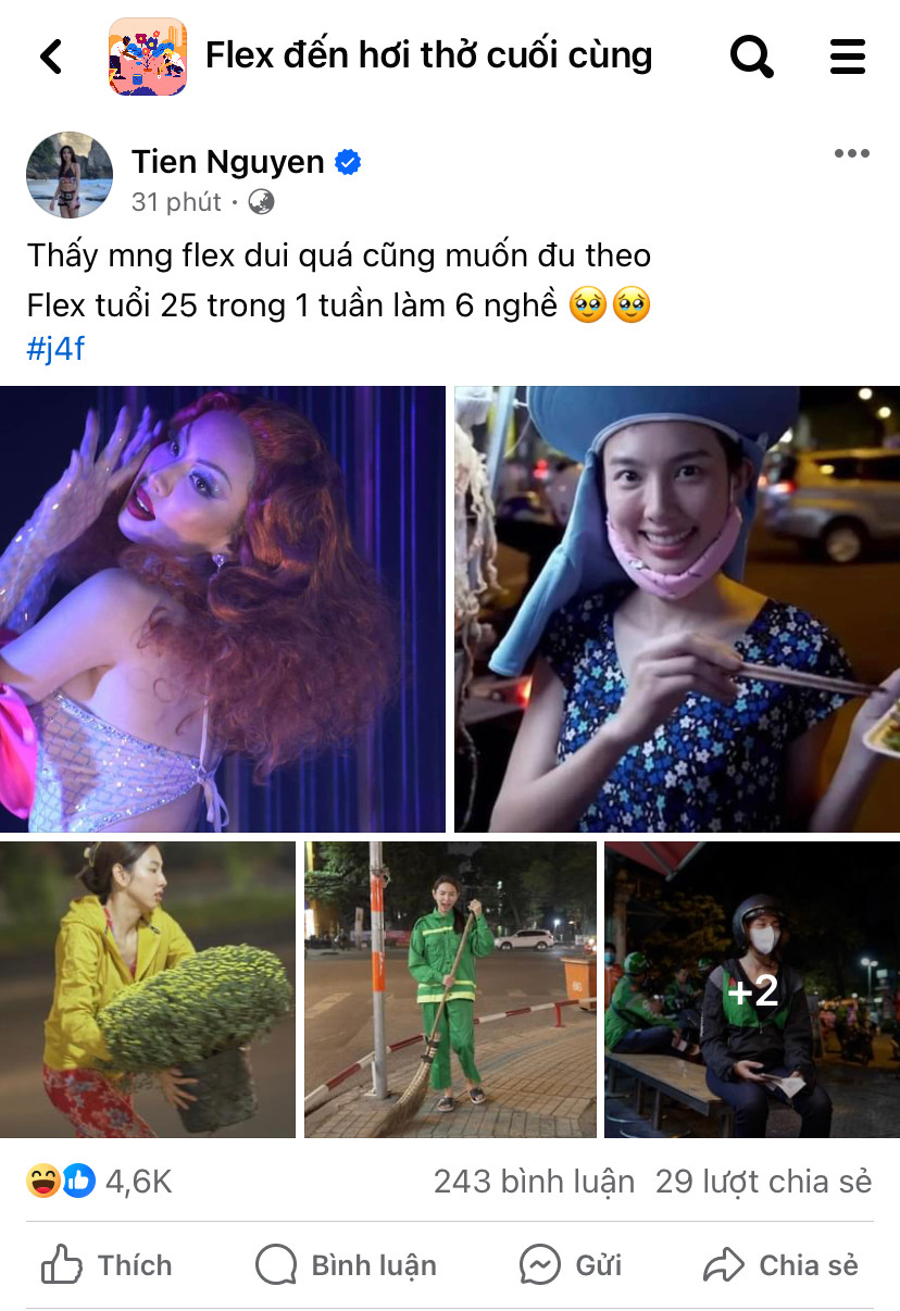 Bài đăng của Hoa hậu Thùy Tiên bất ngờ xuất hiện trong nhóm "Flex đến hơi thở cuối cùng".Nàng hậu đã khoe khéo số lượng công việc mới mình thử sức kèm dòng trạng thái: "Thấy mọi người flex vui quá cũng muốn đu theo. Flex tuổi 25 trong 1 tuần làm 6 nghề".